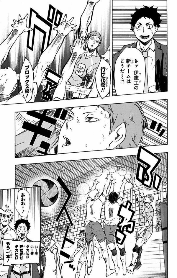 縁下などの活躍で、烏野は和久谷南を破り代表決定戦準決勝へ。次の相手は青葉城西と伊達工業の勝者!! 県No.1セッター・及川率いる青城と、新たな鉄壁を築いた伊達工の両者一歩も譲らぬ戦いを制するのは…!?