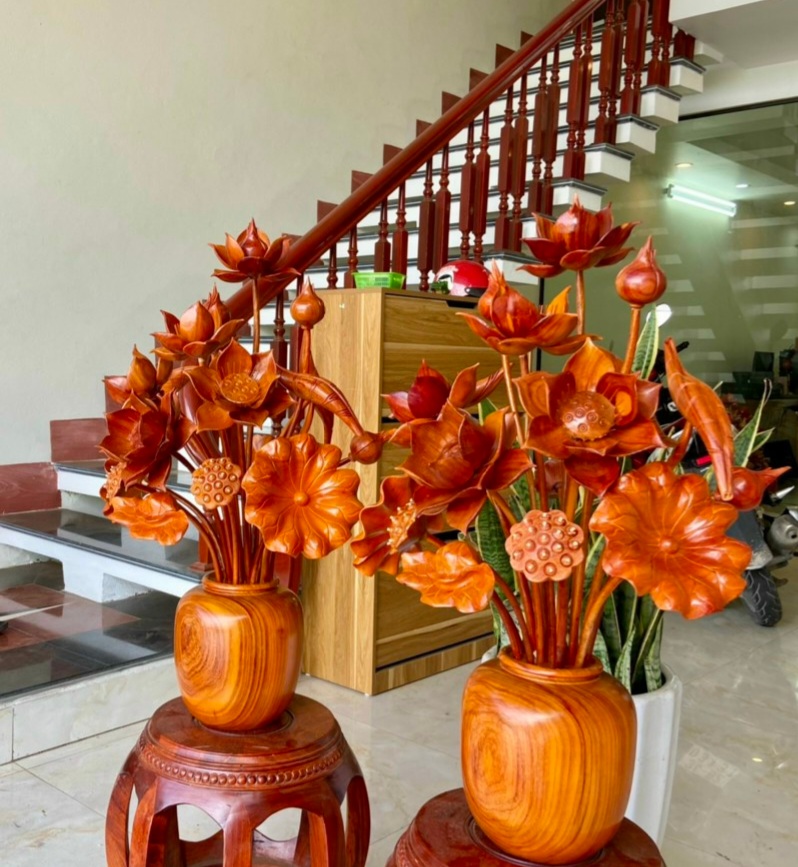 _ 2 Bình hoa sen trang trí phòng thờ phòng khách được làm bằng chất liệu bình cắm gỗ hương đỏ và hoa lá gương bằng gỗ ngọc am tự nhiên 100% _ Kích thước
