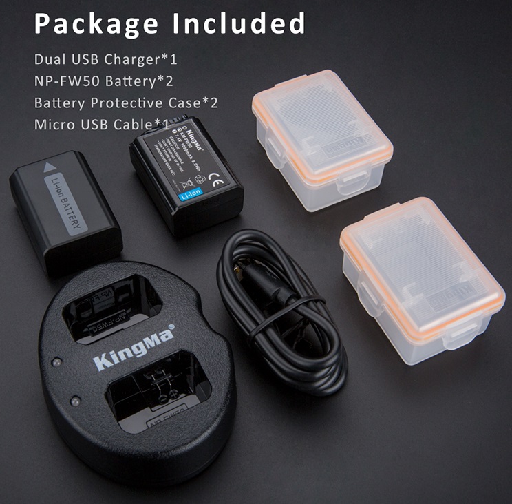 Bộ 1 pin 1 sạc đôi Kingma cho pin Sony NP-FW50 Thông tin sản phẩm: Pin Kingma for Sony NP-FW50 -Model: NP-FW50; -Điện áp 7.4V; -Công suất: 1080mAh 8.0Wh; -Loại pin: Pin Li-ion; -Kích thước: