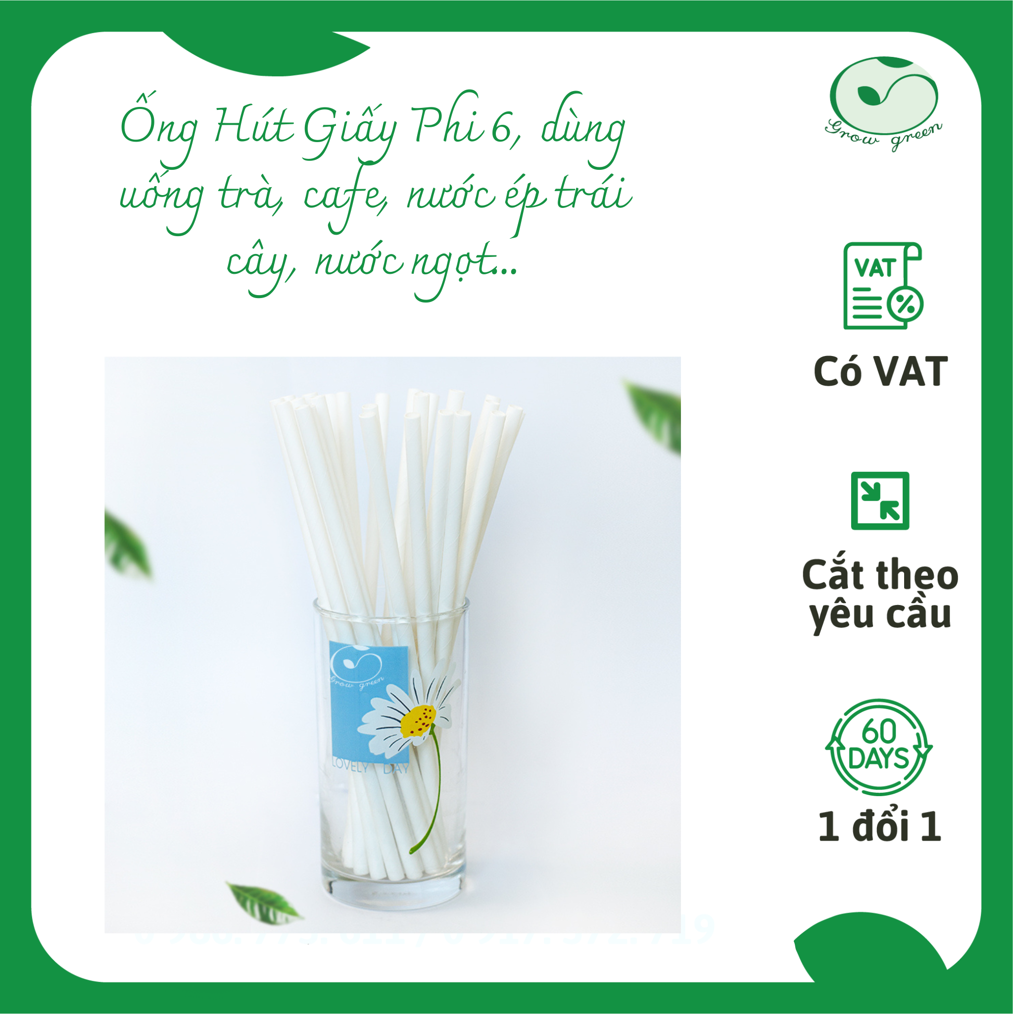 ỐNG HÚT GIẤY KÍCH THƯỚC D8X197MM CÓ MÀNG BỌC BẰNG GIẤY TỪNG CÁI. - Thương hiệu Growgreen; - Màu sắc: Trắng. - Kích thước: Đường kính 8mm, dài 19.7cm. - Xuất xứ thương hiệu Việt