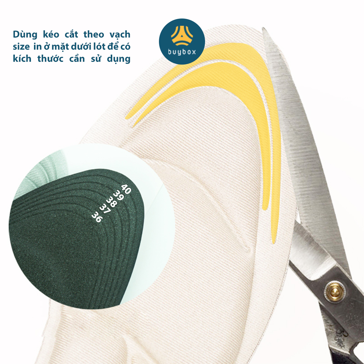 - Đặt lót đa năng vào giày, tháo giấy có keo phía sau để định phần lót gót cố định vào giày Lưu ý: Sản phẩm mang thương hiệu buybox có bao bì in logo và hướng dẫn sử dụng chi tiết đi kèm.