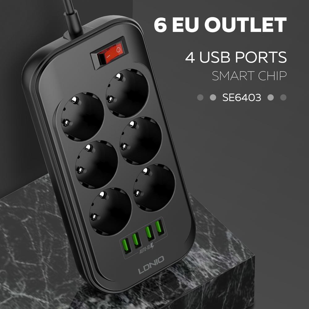 Equipped with 6 power sockets and 4 USB, suitable for chargings smartphones, tablets, desk lamps, computers and other devices at the same time, fine for home, office, in the workshop. Features: With 6 standard EU