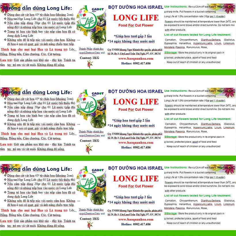 BÍ QUYẾT SHOP HOA GIỮ HOA TƯƠI LÂU VÀ KHÔNG THAY HOA ĐỊNH KỲ BẰNG BỘT DƯỠNG HOA LONGLIFFE SG CỦA ISRAEL  (COMBO 3 HỘP 1KG TIẾT KIỆM CHI PHÍ) - MÔ TẢ SẢN PHẨM