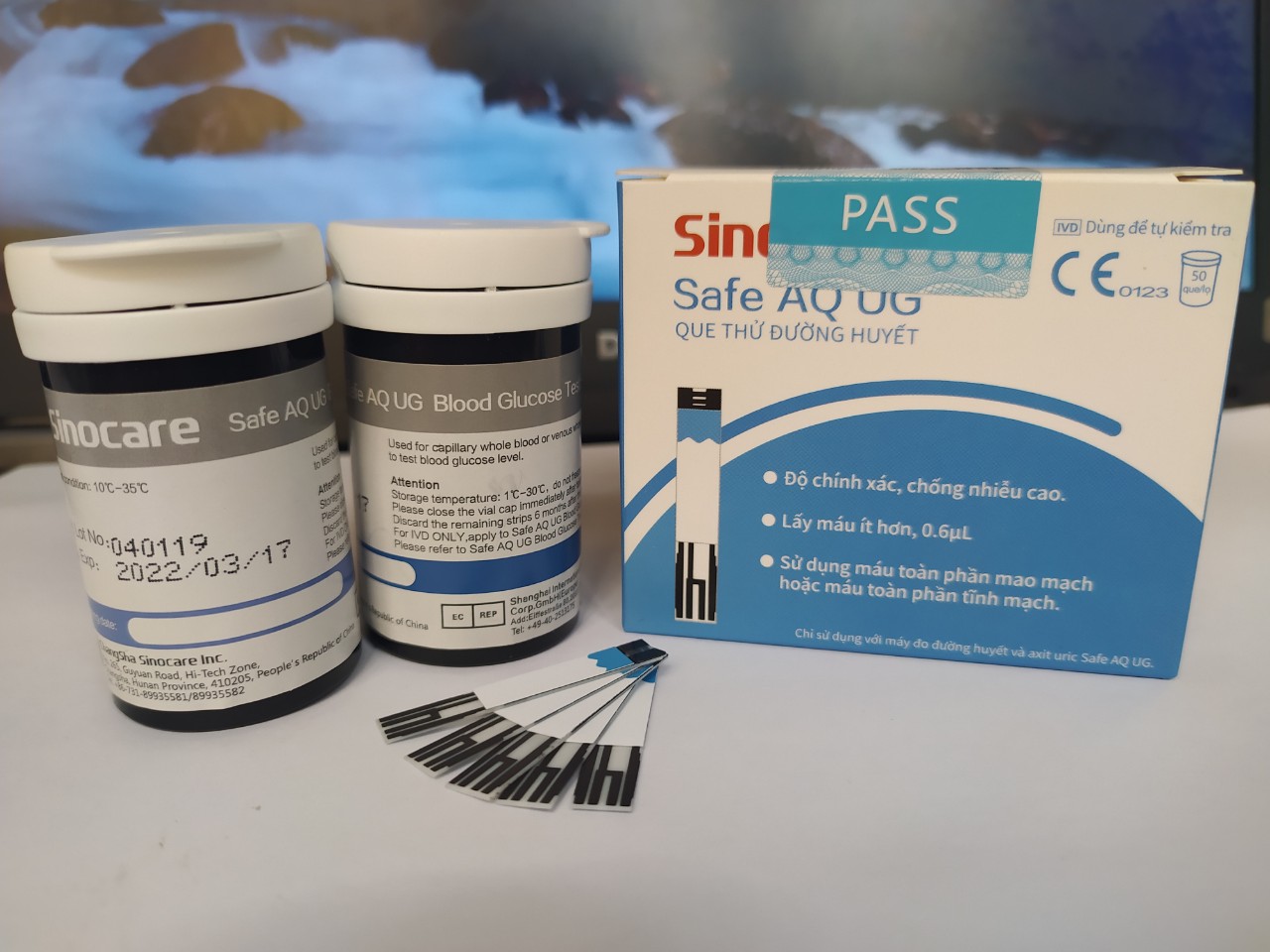 - Hộp 50 que thử đường huyết dùng cho máy Sinocare Safe AQ UG + 50 kim chích máu ( Tặng kèm) Công dụng: Que thử đường huyết Safe AQ UG được sử dụng cho máy đo đường huyết và Axit Uric Sinocare Safe AQ UG để đo định lượng glucose ( đường) trong các mẫu máu toàn phần mao mạch được lấy từ đầu ngón tay hoặc mẫu máu toàn phần tĩnh mạch. Que thử không yêu cầu mã hóa bảo quản khô ráo, dùng xong đậy nắp luôn