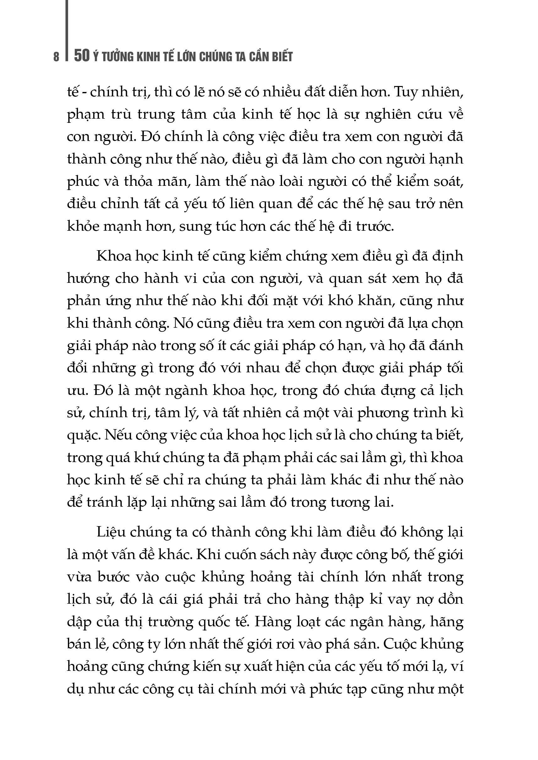 Cuốn sách này diễn giải một cách đơn giản mà một nền kinh tế vận hành. Một vài mặt trái của kinh tế không làm tất cả mọi thứ trở nên quá phức tạp. Vì đó là khoa học nghiên cứu về con người, và cũng vì các ý tưởng của nó thường không khác gì các hiện tượng có tính chung khác. Cuốn sách này cũng không nhằm để đọc như những bài văn tường thuật liên tiếp nhau, mỗi một ý tưởng trong số 50 ý tưởng kinh tế trình bày trong cuốn sách đều có ý nghĩa riêng.