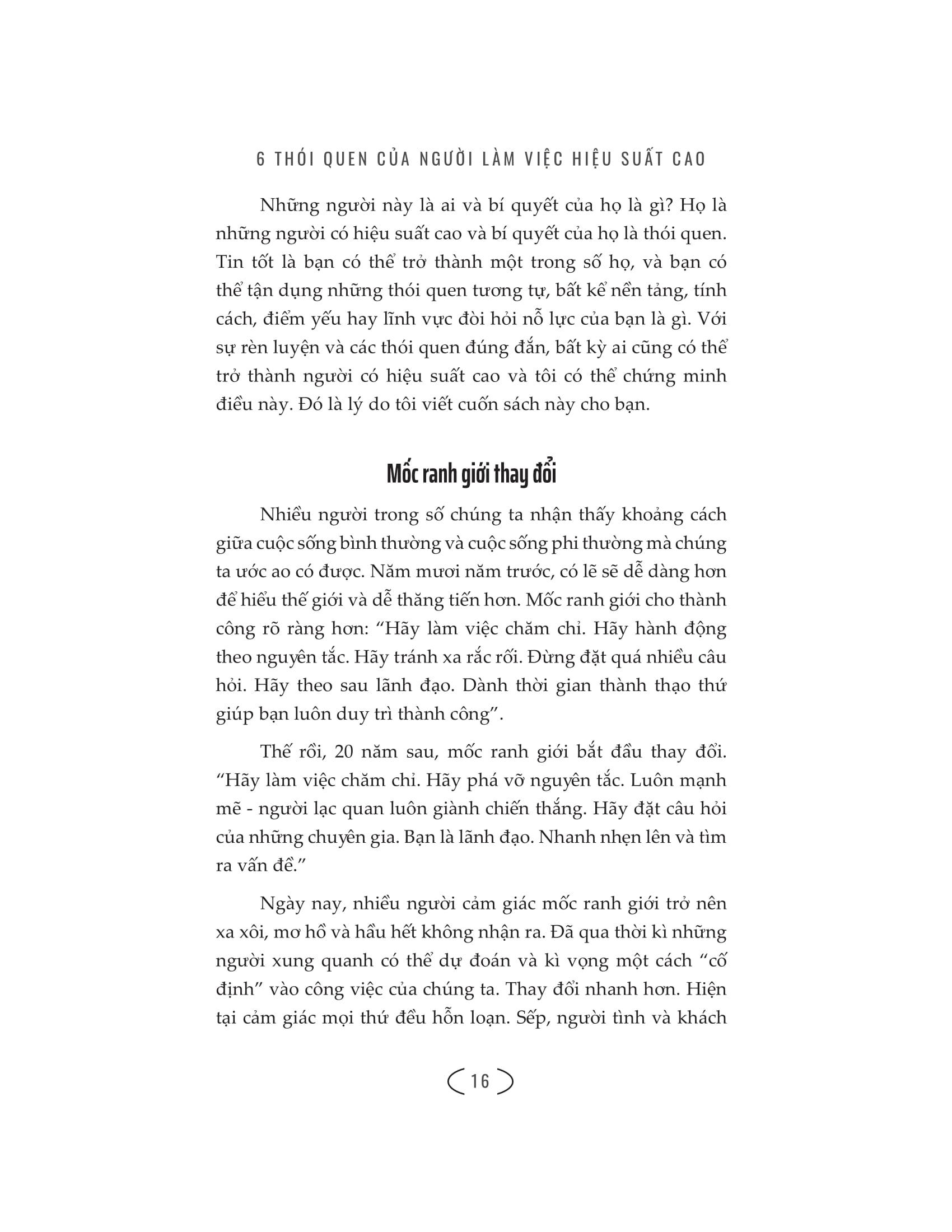 - Thể hiện lòng can đảm Cuốn sách “High performance habits – 6 thói quen của người làm việc hiệu suất cao” diễn giải chi tiết cách thức để thực hành những thói quen này. Cuốn sách đã tổng hợp những nghiên cứu trong 20 năm của tác giả Brendon Burchard từ hoạt động huấn luyện của mình. Đây là các tổng kết đắt giá nhất có được nhờ các cuộc khảo sát, phỏng vấn tiêu chuẩn và các công cụ đánh giá chuyên nghiệp về những người có hiệu suất cao trên toàn thế giới. Tác phẩm hé lộ một người nên nắm bắt điều gì để trở thành một người hiệu suất cao – có thể tạo ra những cấp độ ngày càng tăng của hạnh phúc, sức khỏe và thành công lâu dài. Nếu bạn muốn hình thành một thói quen nào mới để thành công nhanh hơn, hãy chọn những thói quen trong cuốn sách này. Bất cứ ai cũng có thể thực hành chúng, và bạn sẽ thấy những điều phi thường xảy ra trong cuộc sống, các mối quan hệ và sự nghiệp. Nếu bạn muốn đạt được nhiều thứ hơn, lãnh đạo tốt hơn, phát triển kĩ năng nhanh hơn, hoặc đạt được nhiều niềm vui và tự tin hơn, “High performance habits – 6 thói quen của người làm việc hiệu suất cao” sẽ trợ giúp đắc lực cho bạn.