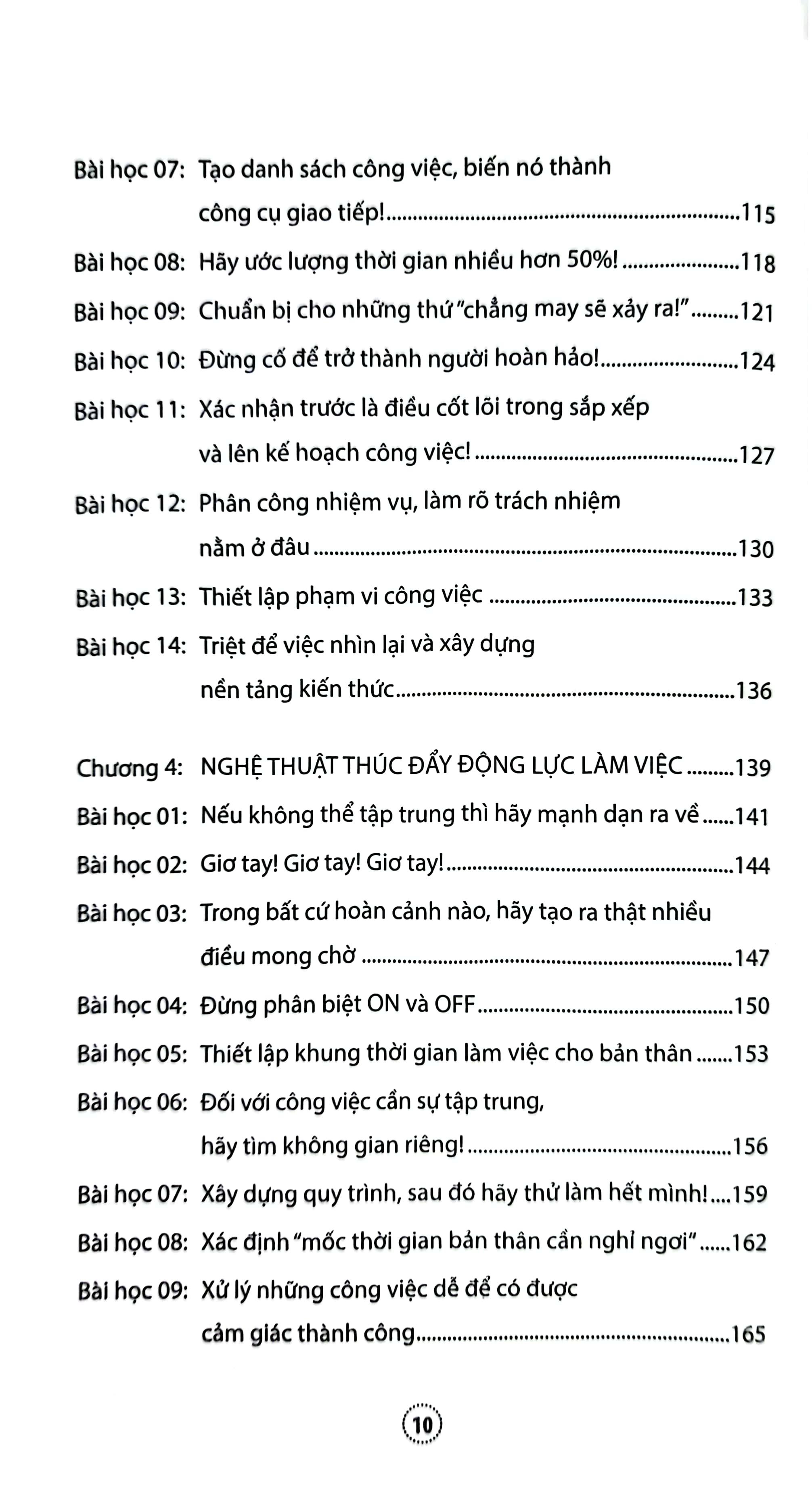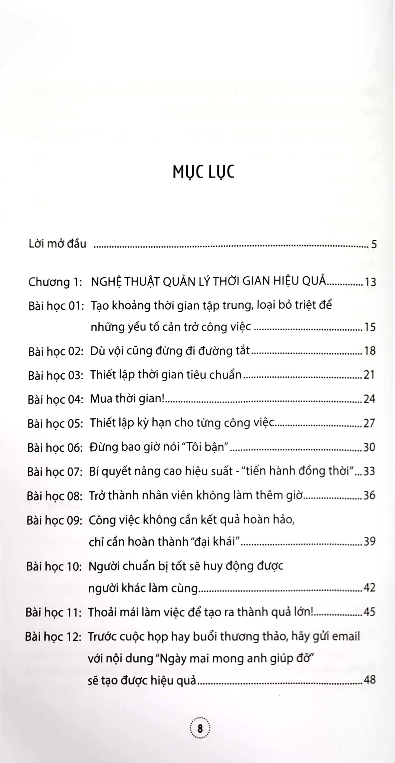 • Và giảng dạy tại nhiều trường đại học. Nếu bạn làm việc trong mơ hồ, sống những ngày tháng mơ hồ, thì cuộc đời bạn cũng có nguy cơ kết thúc trong mơ hồ. Bạn nên nhìn nhận nguy cơ ấy để phấn đấu. Thời còn đi học, ở một mức độ nhất định chúng ta có thể tiến hành mọi việc suôn sẻ chỉ cần dựa theo những thời gian biểu sẵn có. Tuy nhiên, những quy trình ấy sẽ mất đi khi bắt đầu đi làm. Bởi lẽ, chính bản thân chúng ta có nhiệm vụ tạo ra các quy trình đó. Nói đến sức mạnh của quá trình chuẩn bị và lên kế hoạch, không chỉ đối với công việc, nó còn cần thiết trong cả cuộc sống hằng ngày như khi chuyển nhà, trong các nghi thức quan trọng như kết hôn, tang lễ hay giỗ chạp, cho đến các môn thể thao như bóng chày, bóng đá. Chắc các bạn cũng đã từng có kinh nghiệm đến tham dự những buổi tiệc mà người chủ trì vụng về trong khâu chuẩn bị và lên kế hoạch đúng không? Tại nơi làm việc, dù bạn đang nắm giữ bất kỳ chức vụ hay đang đảm nhiệm công việc nào như bán hàng, lên kế hoạch hay tổng hợp, thì cũng cần kỹ năng phác thảo trước toàn bộ công việc để tiến hành suôn sẻ. Sản xuất, IT, tài chính, bất động sản, dịch vụ, hay bất cứ lĩnh vực kinh doanh nào khác cũng giống như vậy. Có thể nói chuẩn bị và lên kế hoạch là kỹ năng nền tảng mà người nào đi làm cũng cần trang bị cho bản thân. Tại các công ty, Những người kém kỹ năng này thường dễ bị gắn mác là trời sinh ra đã “dốt sẵn”, “tầm nhìn hạn hẹp”. Nhưng bằng việc rèn luyện, mỗi ngày chịu khó quan sát và hành động, chắc chắn thành quả sẽ tăng lên. Về cơ bản, cách chuẩn bị và lên kế hoạch có thể học được bằng cách quan sát những người xung quanh. Vì thế, không ít người đã hệ thống hóa và học cách chuẩn bị, lên kế hoạch cũng như cách tiến hành công việc. Vậy nên, trong cuốn sách này, tác giả đã chủ ý sắp xếp, kết hợp những ví dụ thực tế của bản thân cùng nhiều hình ảnh minh họa để hỗ trợ cho các độc giả trong việc hoàn thiện kỹ năng này. Nhà xuất bản và tác giả hy vọng các độc giả có thể vừa đọc vừa liên hệ với bản thân, suy ngẫm về những trường hợp cụ thể có thể áp dụng trong cuộc sống, kiểu như “cách làm này có vẻ áp dụng được cho công việc của m.ình!”, hay “m.ình sẽ thử bắt đầu cho đứa em cùng bộ phận!”. Nghệ thuật chuẩn bị và sắp xếp công việc - 77 thói quen làm việc hiệu quả giúp bạn có thêm những kĩ năng cần thiết để phát triển tư duy và hoàn thành tốt công việc. Nghệ thuật quản lý thời gian hiệu quả Nghệ thuật tăng tốc công việc Nghệ thuật triển khai dự án hiệu quả Nghệ thuật thúc đẩy động lực làm việc Nghệ thuật nâng cao năng lực tư duy Nghệ thuật sử dụng công cụ hiệu quả Nội dung chi tiết: Chương 1: NGHỆ THUẬT QUẢN LÝ THỜI GIAN HIỆU QUẢ Bài học 01: Tạo khoảng thời gian tập trung, loại bỏ triệt để những yếu tố cản trở công việc Bài học 02: Dù vội cũng đừng đi đường tắt Bài học 03: Thiết lập thời gian tiêu chuẩn Bài học 04: Mua thời gian! Bài học 05: Thiết lập kỳ hạn cho từng công việc Bài học 06: Đừng bao giờ nói “Tôi bận” Bài học 07: Bí quyết nâng cao hiệu suất - “tiến hành đồng thời” Bài học 08: Trở thành nhân viên không làm thêm giờ Bài học 09: Công việc không cần kết quả hoàn hảo, chỉ cần hoàn thành “đại khái” Bài học 10: Người chuẩn bị tốt sẽ huy động được người khác làm cùng Bài học 11: Thoải mái làm việc để tạo ra thành quả lớn! Bài học 12: Trước cuộc họp hay buổi thương thảo, hãy gửi với nội dung “Ngày mai mong anh giúp đỡ” sẽ tạo được hiệu quả Chương 2: NGHỆ THUẬT TĂNG TỐC CÔNG VIỆC Bài học 01: “Hãy coi trọng thời gian, dù chỉ 5 phút” Bài học 02: Dừng việc gửi mail từng li từng tí lại. Hãy gọi điện thoại ngay tức khắc Bài học 03: Thời gian có thể tập trung, công việc có thể tập trung Bài học 04: Phải cần cù xúc tiến công việc từng bước một Bài học 05: Bắt tay làm từ những việc đơn giản và có hiệu quả Bài học 06: Không nên nhầm lẫn công việc nên làm với công việc cần phải làm Bài học 07: Xử lý trước các công việc nhỏ nhặt! Bài học 08: Đừng đặt mục tiêu làm một lần OK luôn Bài học 09: Đừng để bị cấp trên sử dụng, hãy sử dụng cấp trên Bài học 10: Hãy mạnh dạn từ bỏ công việc! Bài học 11: Xác nhận ngay tại cuộc họp! Bài học 12: Càng những công việc cảm thấy xấu hổ, càng phải xử lý sớm! Bài học 13: Chia nhỏ công việc Bài học 14: Quy tắc Ho-ren-so Chương 3: NGHỆ THUẬT TRIỂN KHAI DỰ ÁN HIỆU QUẢ Bài học 01: Hãy viết ra những việc ngày mai bạn phải làm Bài học 02: Đừng làm những công việc “làm cho xong”! Bài học 03: Hãy nghĩ cách chia nhỏ con đường dẫn đến đích! Bài học 04: Hãy nắm rõ những người liên quan xung quanh! Bài học 05: Phương pháp biến những người xung qua