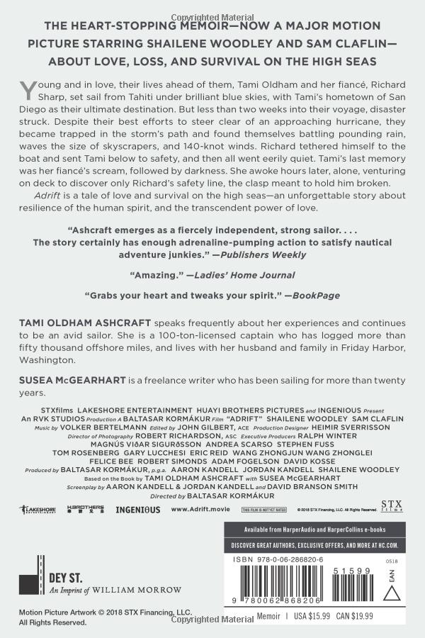 New York Times Bestseller The heart-stopping memoir, soon to be a major motion picture starring Shailene Woodley and Sam Claflin, and directed by Baltasar Kormákur (Everest). "An inspirational and empowering read."--Shailene Woodley Young and in love, their lives ahead of them, Tami Oldham and her fiancé Richard Sharp set sail from Tahiti under brilliant blue skies, with Tami's hometown of San Diego as their ultimate destination. But the two free spirits and avid sailors couldn't anticipate that less than two weeks into their voyage, they would sail directly into one of the most catastrophic hurricanes in recorded history. They found themselves battling pounding rain, waves the size of skyscrapers, and 140 knot winds. Richard tethered himself to the boat and sent Tami below to safety, and then all went eerily quiet. Hours later, Tami awakened to find the boat in ruins, and Richard nowhere in sight. Adrift is the story of Tami's miraculous forty-one-day journey to safety on a ravaged boat with no motor and no masts, and with little hope for rescue. It's a tale of love and survival on the high seas-- an unforgettable story about resilience of the human spirit, and the transcendent power of love .