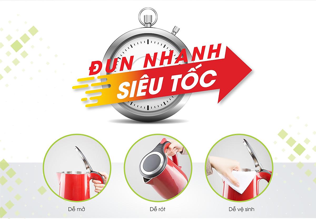 Đặc điểm nổi bật: Thiết kế sang trọng, hiện đại với màu sắc trang nhã Công suất 1800W đun sôi mạnh mẽ, nhanh chóng Dung tích 1.8 lít đủ phục vụ nhu cầu của cả
