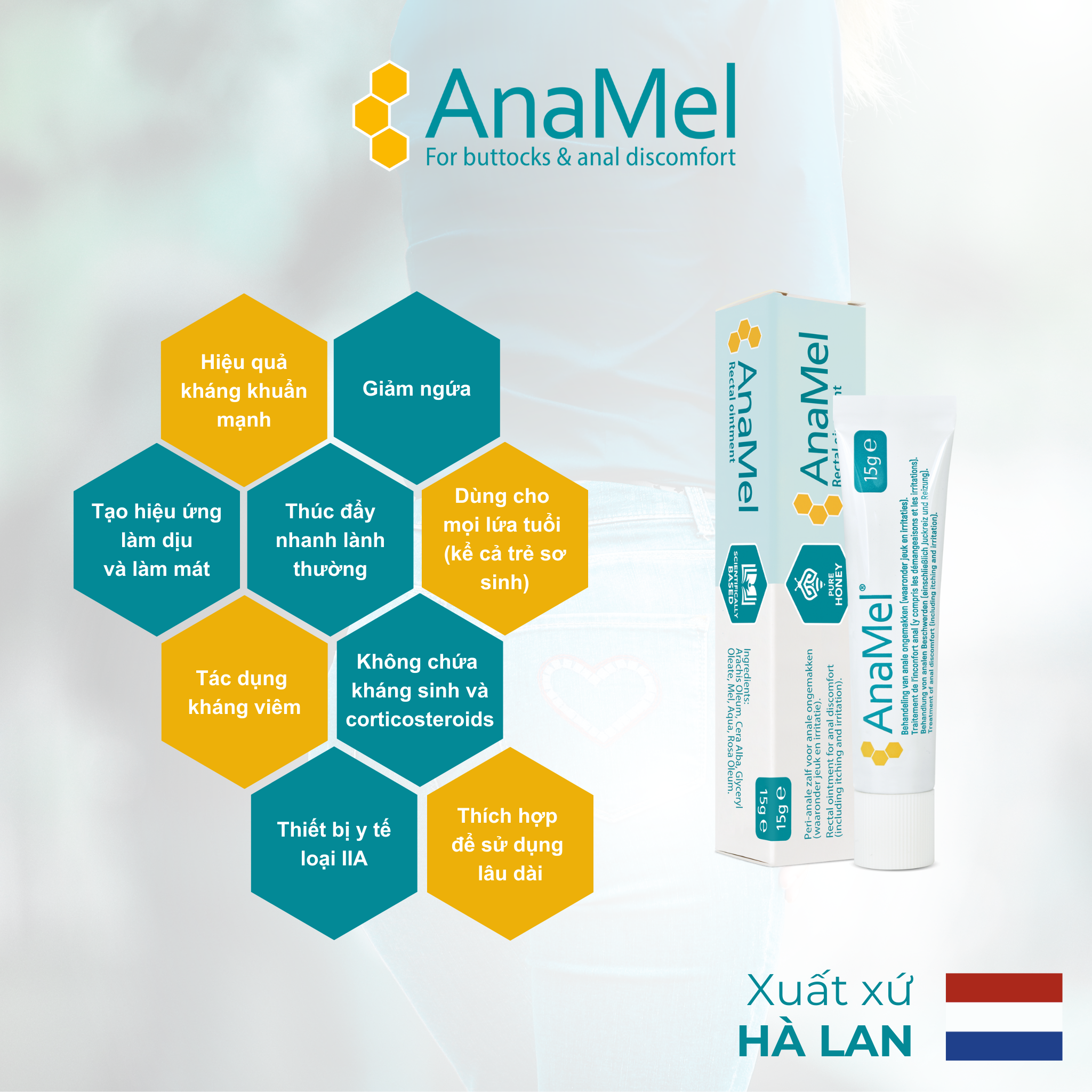 - Thích hợp để sử dụng lâu dài THÀNH PHẦN SẢN PHẨM AnaMel là kem làm dịu da, có thành phần chính là mật ong nguyên chất (revamil honey). CÁC ỨNG DỤNG CỦA SẢN PHẨM AnaMel được dùng cho các vết thương nông và khó chịu ở vùng hậu môn trực tràng:
