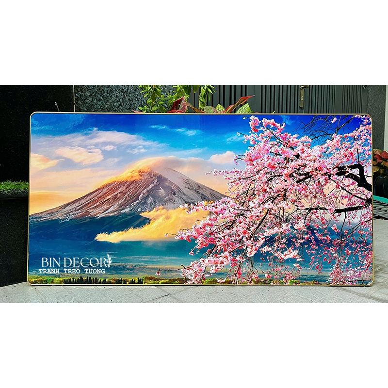 ✨(ẢNH CHỤP) Tranh treo tường tráng gương núi phú sĩ và cành hoa uv mặt mica sáng bóng