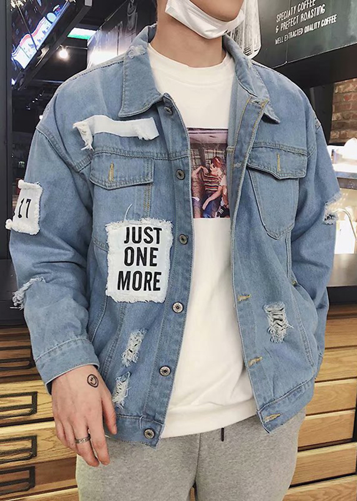 Áo khoác jeans xanh rách Uniex Just One More cực chất Chất Liệu: Vải Jean xịn mặc mát, form đẹp Size : S, M, L, XL, XXl Áo khoác jean form rộng Unisex nam nữ
