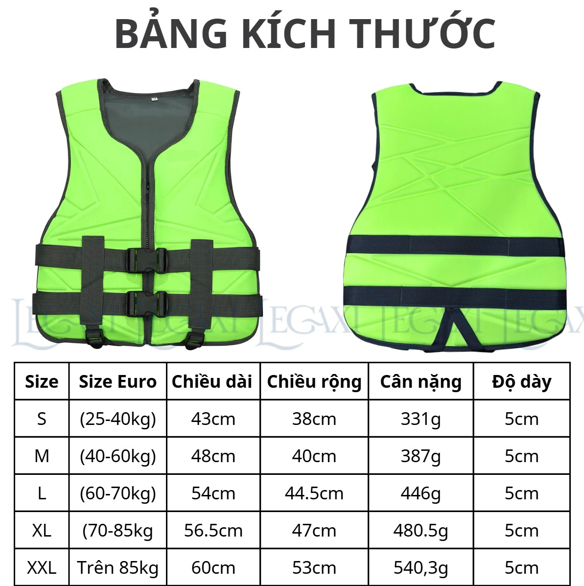 ÁO PHAO BƠI NGƯỜI LỚN, TRẺ EM LEGAXI– AN TOÀN TUYỆT ĐỐI KHI ĐI BIỂN, CHÈO THUYỀN, BƠI LỘI, CỨU HỘ THÔNG TIN SẢN PHẨM: Tên sản phẩm: Tên sản phẩm: Áo phao bơi cứu sinh người lớn, trẻ em Chất liệu: Vải chống thấm nước, ruột cao su tổng hợp Màu sắc: Xanh Thiết kế: Dây khóa chắc chắn, dễ mặc – dễ tháo Kích thước: Size S: Dài 43cm, rộng 38cm - Phù hợp với Trọng lượng 25-40kg Size M: Dài 48cm, rộng 40cm - Phù hợp với Trọng lượng 40-60kg Size L: Dài 54cm, rộng 44.5cm - Phù hợp với Trọng lượng 60-70kg Size XL: Dài 56.5cm, rộng 47cm - Phù hợp với Trọng lượng 70-85kg Size XXL: Dài 60cm, rộng 53cm - Phù hợp với Trọng lượng 85-110kg CÔNG DỤNG NỔI BẬT: Chất liệu Neoprene êm ái, bền bỉ, chống nước, giữ ấm tốt Giúp giữ nổi cơ thể khi xuống nước – bảo vệ an toàn Thích hợp cho du lịch biển, hồ, chèo thuyền, câu cá, đi SUP Gọn nhẹ, thoáng khí, không gây nóng hay bí khi mặc lâu Dễ gấp gọn, tiện mang theo balo, vali, xe máy Phù hợp cả nam và nữ, người lớn tuổi, thanh niên ỨNG DỤNG THỰC TẾ: Du lịch biển, đi chơi đảo, đi cano Chèo thuyền kayak, sup, phao nước Hồ bơi, sông suối, hồ thủy điện, hồ câu cá Trang bị cho gia đình khi đi phượt, picnic