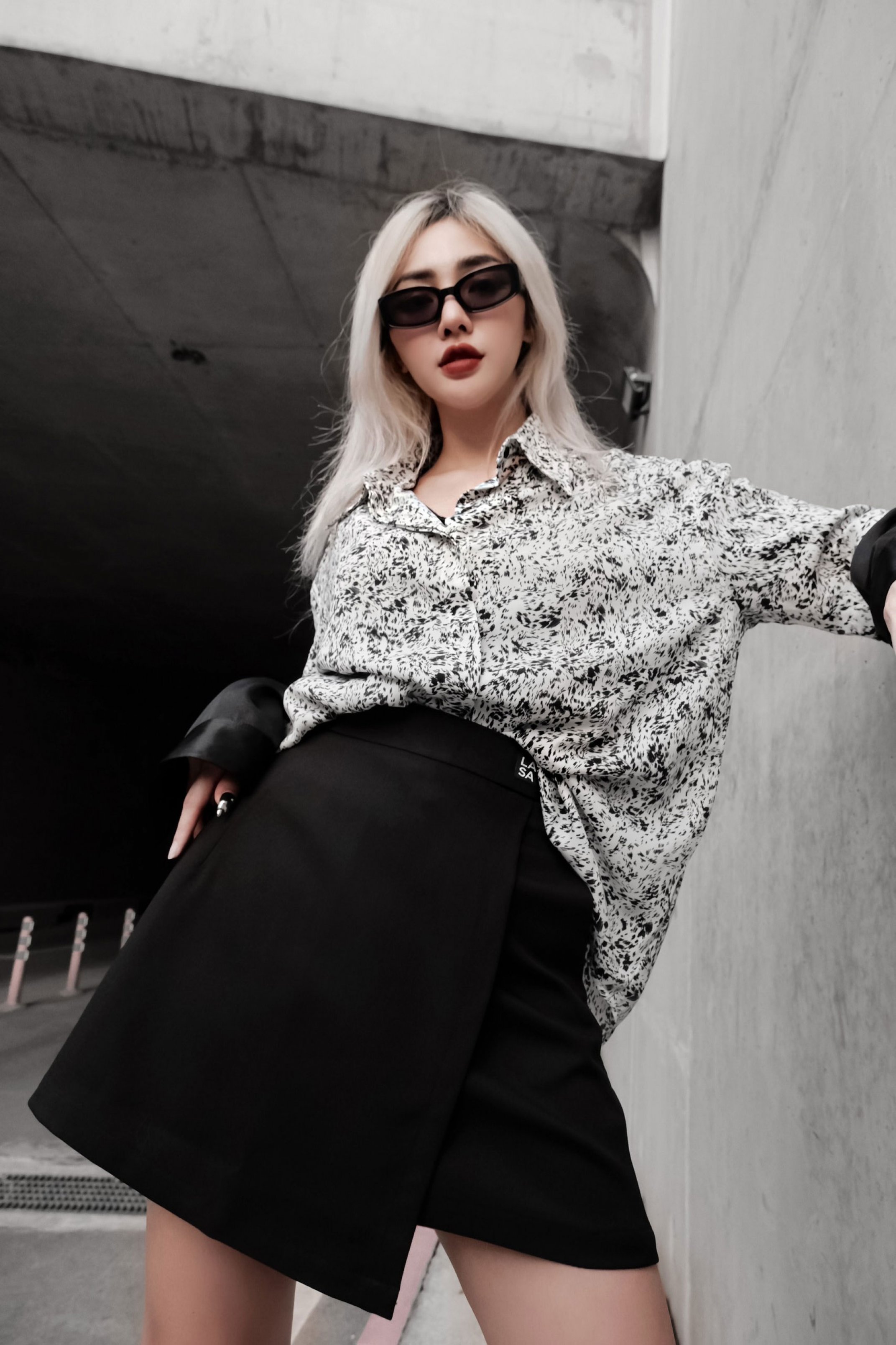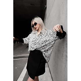 CHẤT LIỆU MANGO, MỀM MƯỢT, KHÔNG NHĂN ÁO MÀU TRẮNG, HOẠ TIẾT MÀU ĐEN ÁO SOMI NẸP GIẤU NÚT FORM RỘNG FREESIZE ĐIỂM NHẤN 1 BÊN TAY PHẢI ÁO GẮN TAG LOGO LAAS