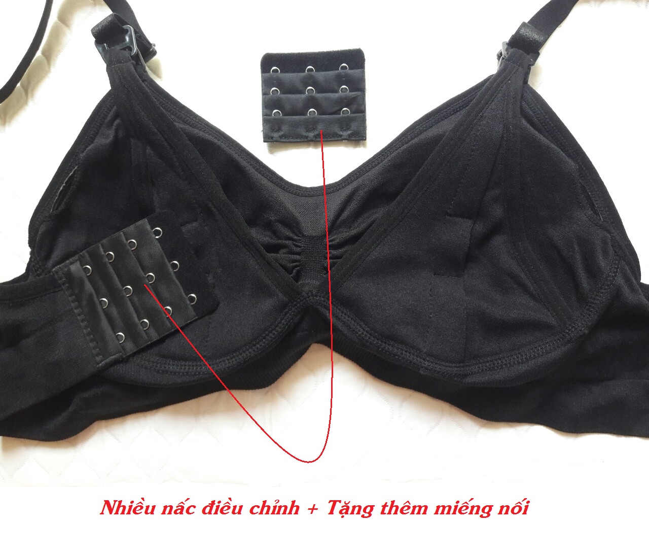 - Áo không gọng, chất liệu co giãn tốt, thoải mái, dễ chịu, mỗi áo lại tặng kèm thêm một miếng nối tăng size áo lót nên có thể mặc từ lúc mang bầu đến sau sinh.