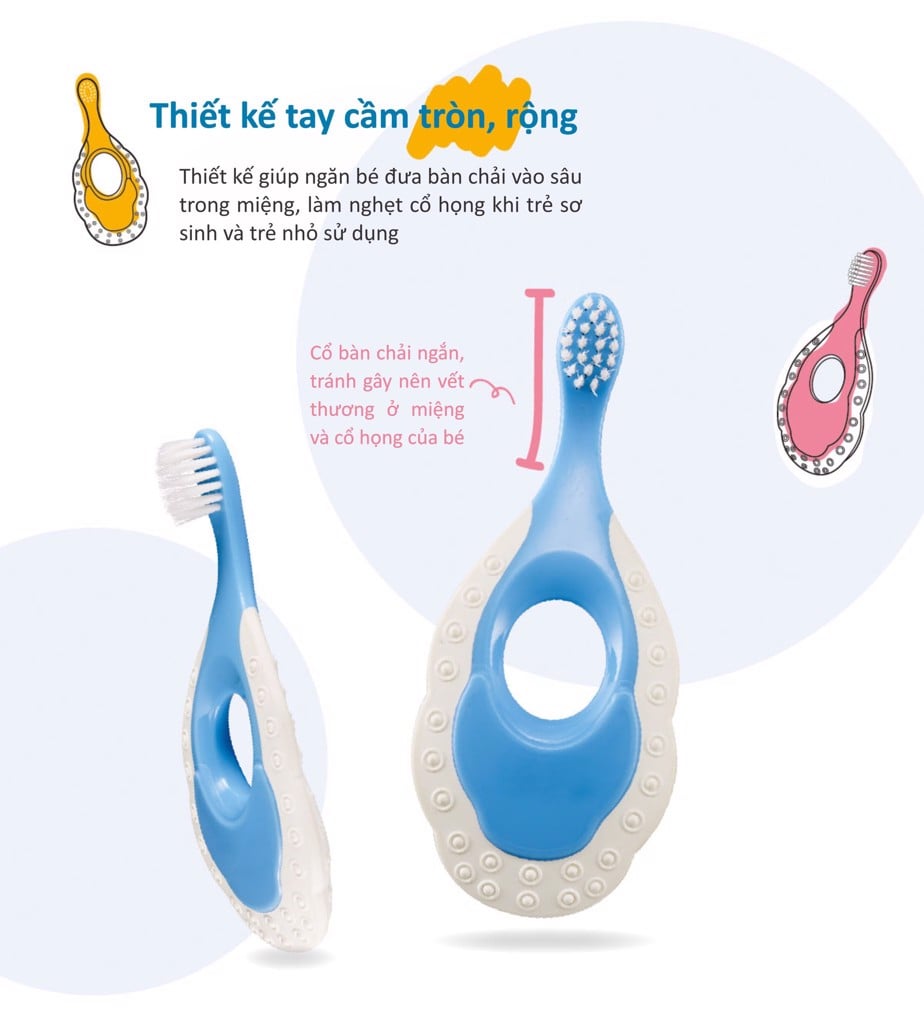 - Thiết kế tay cầm tròn, rộng, giúp ngăn bé đưa bàn chải vào sâu trong miệng, làm nghẹt cổ họng khi trẻ sơ sinh và trẻ nhỏ sử dụng;