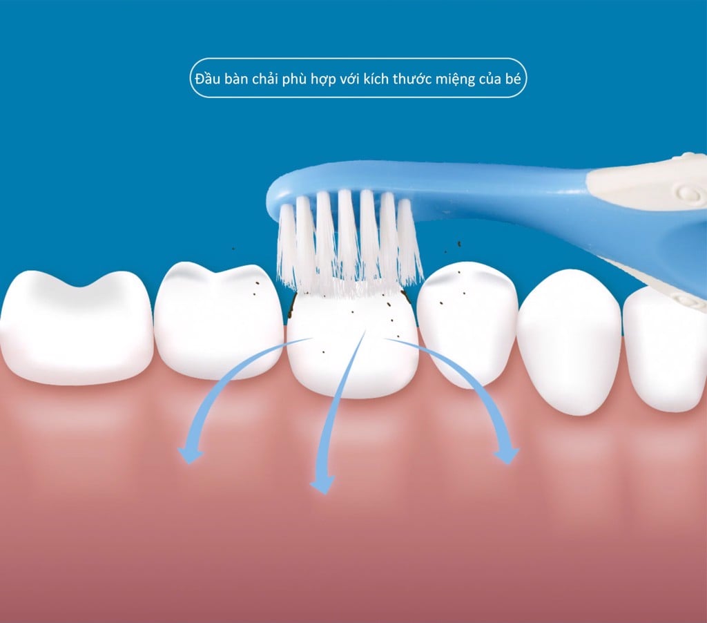 - Đầu bàn chải nhỏ phù hợp với kích thước miệng của bé;