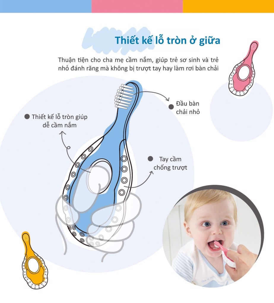 - Thiết kế lỗ tròn ở giữa, thuận tiện cho cha mẹ cầm nắm, giúp trẻ sơ sinh và trẻ nhỏ đánh răng mà không bị trượt tay hay làm rơi bàn chải;