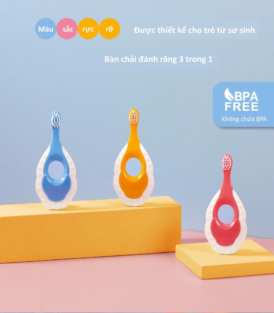 - Bàn chải có 3 màu: Xanh, vàng và hồng dễ thương cho bé lựa chọn.