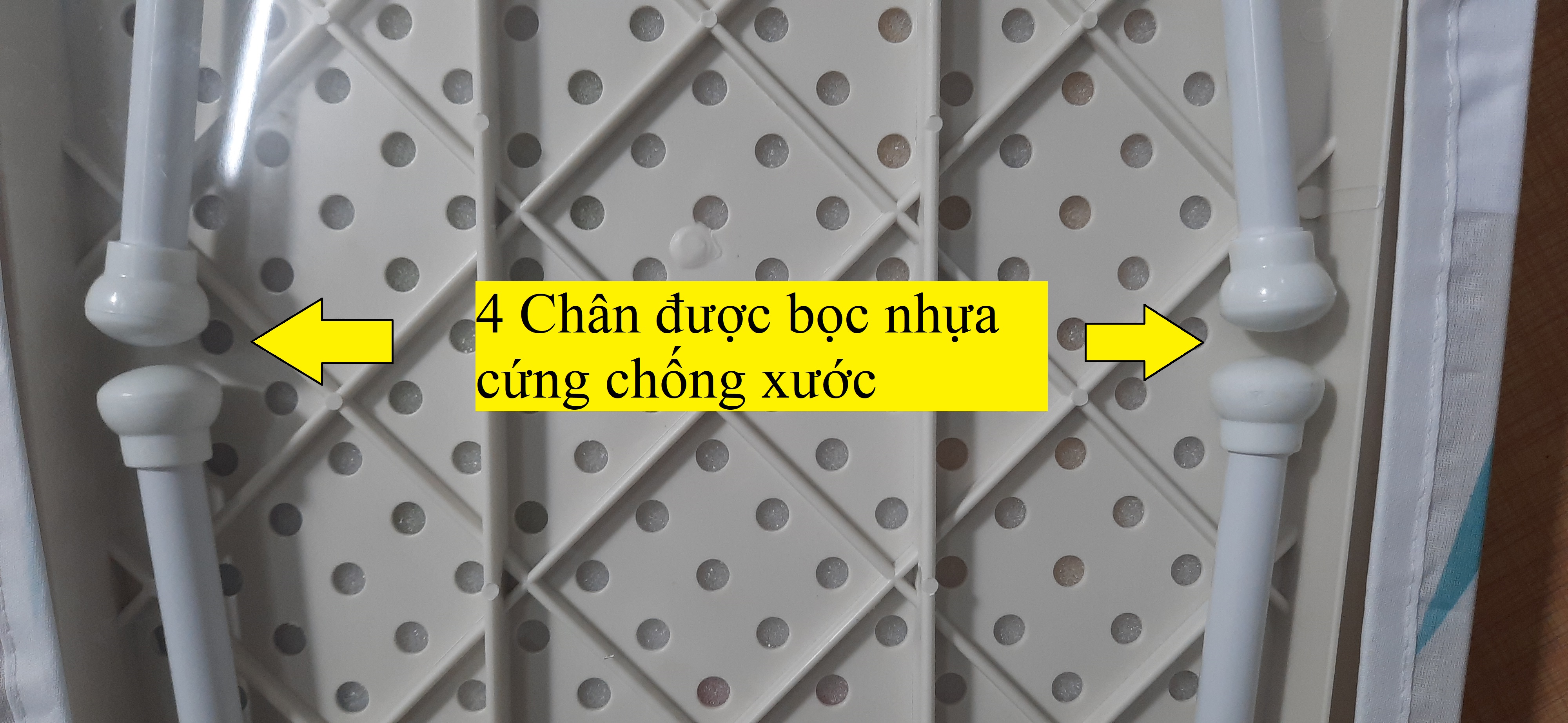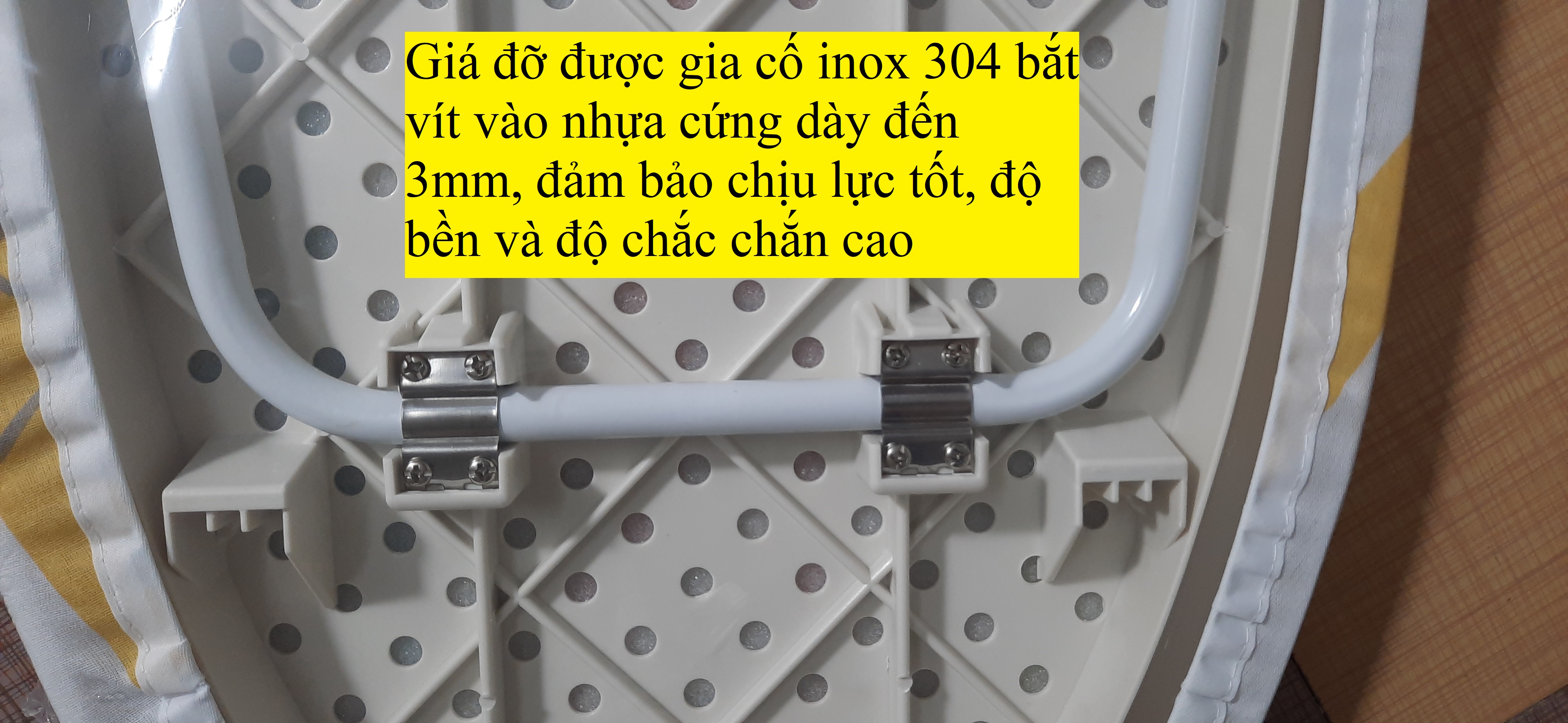 Khung kim loại chắc chắn Khung bằng kim loại, chịu lực tốt và có độ bền cao. Mặt bàn để ủi được làm bằng ván ép chất lượng, đủ độ cứng nhưng vẫn gọn nhẹ