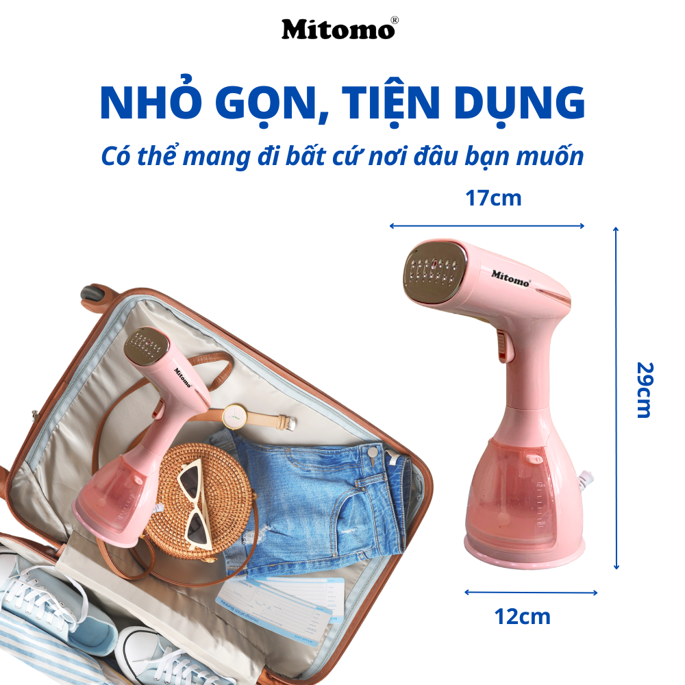 - Bàn là, bàn ủi hơi nước cầm tay Mitomo MW - 801 cao cấp dễ dàng mang theo khi đi du lịch, đi công tác mà không chiếm nhiều diện tích túi đồ của bạn.
