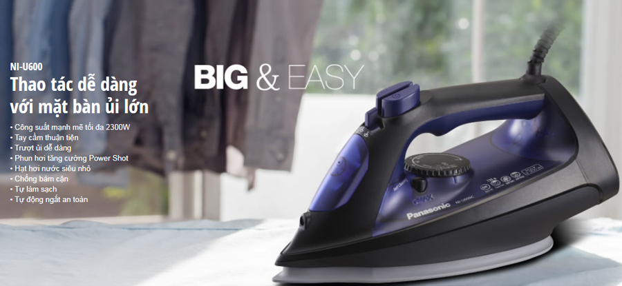 Ngoài ra, bản ủi Panasonic thích hợp với mọi loại vải, có vòng chỉnh nhiệt giúp lựa chọn được mức nhiệt độ phù hợp cho từng loại vải, đèn báo sẽ tự tắt khi đạt mức nhiệt cần thiết, bảo vệ quần áo không bị cháy xém do gặp phải nhiệt độ quá cao. Nổi bật hơn là có cấu tạo các hạt hơi nước siêu nhỏ bao phủ diện tích tích lớn, hiệu quả trong việc loại bỏ các nếp nhăn trên các loại vải tự nhiên như lanh và cotton, không cần phải thay đổi giữa chế độ ủi và phun nước.