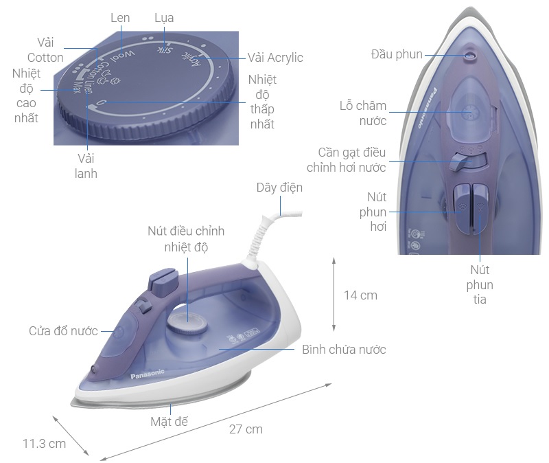 - Bàn ủi có thể ủi khô, ủi hơi nước, phun hơi, phun tia sử dụng tùy theo nhu cầu.