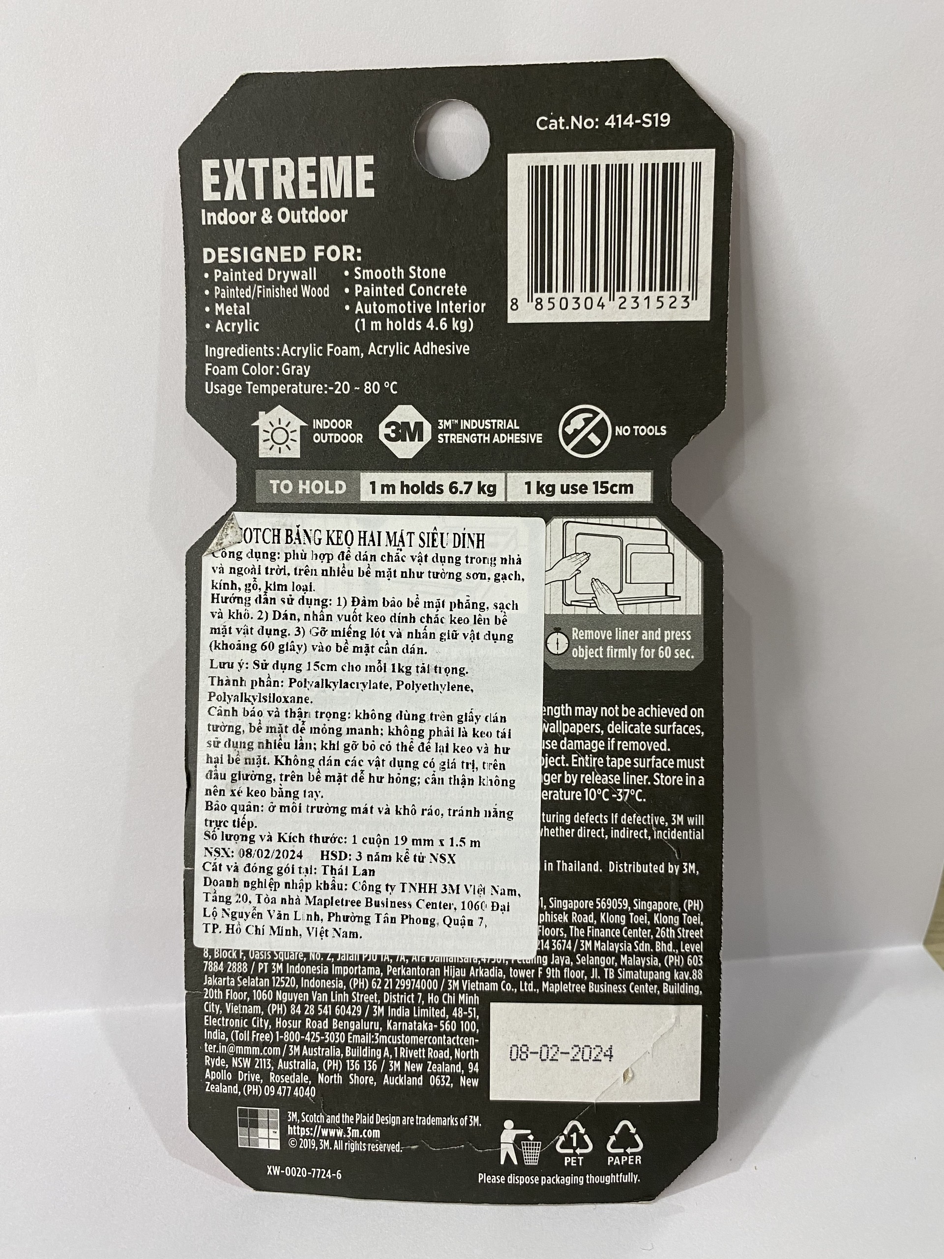 Mua tại TiktokBăng keo hai mặt dùng trong nhà và ngoài trời Scotch 3M siêu dính 414 - Độ bền cao, dính tốt trên bề mặt được sơn, kéo nhẹ nhàng, cắt dễ dàng, được tráng lớp nhựa Acrylic dẻo, chịu nhiệt, có khả năng chống chịu với thời tiết, được thiết kế sử dụng cho cả bên trong nhà và ngoài trời. Được cấu tạo với 3 lớp màng dính siêu bền, chống bụi bẩn, thách thức với thời tiết khắc nghiệt, kết dính lâu dài trên nhiều loại bề mặt khác nhau, bao gồm cả máy móc động cơ của ô tô. Thông số kỹ thuật: Thương hiệu: 3M Xuất xứ thương hiệu: Mỹ Sản xuất tại: Thái Lan Mã sản phẩm: 414-S19 Quy cách: 1 cuộn/vỉ Kích thước: 19mm x 1.5m, 19mm 4m Hạn sử dụng: 3 năm ĐẶC TÍNH SẢN PHẨM