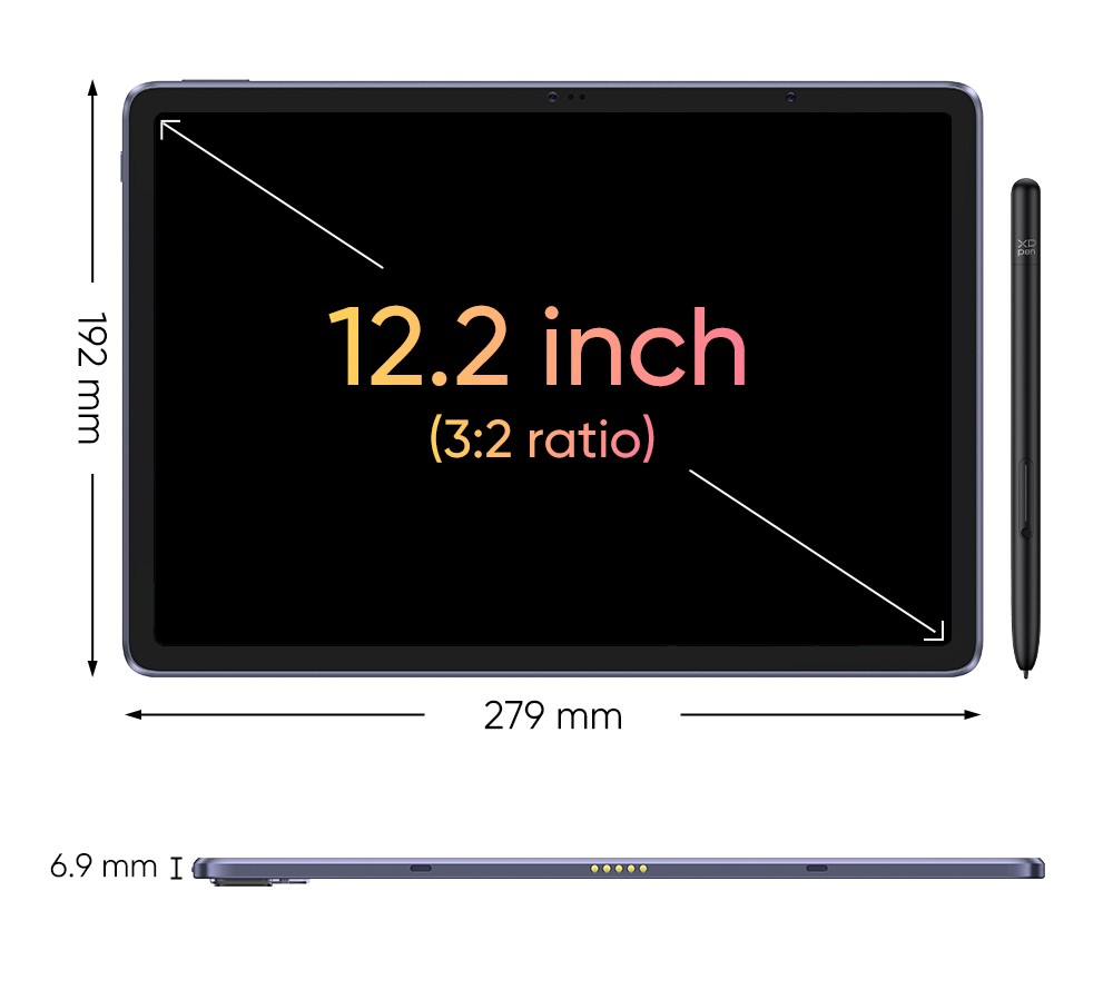 - Màn hình X-Paper mang lại cảm giác hoàn toàn tự nhiên a. Cảm giác như vẽ trên giấy Bạn thích vẽ trên chất liệu truyền thống ư? Màn hình X-Paper được chế tác bằng côngnghệ khắc AG mô phỏng độ ma sát của giấy cao cấp khi bạn di chuyển bút cảm ứng trênbề mặt bảng vẽ Xp-pen Magic Drawing Pad. Đồng thời giảm độ chói không mong muốn và chống bám vân tay. Mang đến cảm giác vẽ quen thuộc, trực quan. b. Màu sắc chân thực Hình ảnh sống động, màu sắc chân thực với gam màu rộng 109% sRGB và 16.77 triệu màu. Bảo đảm ngay cả tác phẩm nghệ thuật có cường độ màu cao nhất cũng trở nên sống động với độ chính xác màu sắc vượt trội. c. Ánh sáng xanh thấp Với thiết kế hướng đến sự thoải mái cho mắt, màn hình X-Paper đạt chứng nhận TÜV Rheinland và được cải tiến với 10 bước xử lý ánh sáng. Do đó, bạn có thể thỏa sức sáng tạo mà không lo mỏi mắt ngay cả khi chạy deadline. d. Vùng vẽ rộng rãi hơnVới tỷ lệ 3:2, màn hình X-Paper 12.2 inch cung cấp không gian làm việc rộng rãi hơn cho ý tưởng bay xa. Và tăng cường dòng chảy sáng tạo của bạn. Dễ dàng ôm trọn tất cả trong tầm nhìn mà không liên tục phóng to thu nhỏ. ● Tỷ lệ 16:9 với máy tính bảng thông thường ● Tỷ lệ 3:2 với Magic Drawing Pad ● Vùng vẽ rộng hơn 18.5% 3.Tích hợp sẵn ibis Paint X a. Miễn phí thành viên Tích hợp công cụ bạn cần để sáng tạo nghệ thuật như một tay chuyên nghiệp. Đưa tác phẩm của bạn lên một tầm cao mới. b. Miễn phí thành viên 3 tháng Miễn phí thành viên 3 tháng khi mua bảng vẽ Xp-pen Magic Drawing Pad và kích hoạt tài khoản ibis Paint X. Phiên bản ibis Paint X phải là V11.1.1 trở lên. Vui lòng cập nhật ibis Paint X trên thiết bị lên phiên bản phù hợp qua Google Play. c. Tương thích liền mạch với bút cảm ứng X3 Pro Cho phép tùy chỉnh chức năng bút cảm ứng trong App Setting. Tùy chỉnh chức năng bút cảm ứng bằng cách thiết lập chức năng nút bấm trong App Setting. Chuyển đổi chức năng bút cảm ứng thông qua nhấn nút. Và điều tuyệt vời nhất là gì? ● Không cần cáp. Không cần thiết bị kết nối. ● Không ràng buộc! ● Mỏng chỉ 6.9 mm, nặng 599 g ● Chỉ cần bỏ vào túi và mang đi. a. Máy trạm độc lập Không cần kết nối Mac hoặc PC. Chạy độc lập trên thiết bị Android. Cầm lên là sử dụng được ngay. b. Toàn bộ portfolio nằm gọn trong lòng bàn tay Với ROM 256 GB, Xp-pen Magic Drawing Pad đủ sức đáp ứng nhu cầu lưu trữ số lượng lớn bản vẽ. Hãy sẵn sàng gây ấn tượng với khách hàng tiềm năng bằng tác phẩm nghệ thuật của bạn bất cứ lúc nào. c. Thỏa sức sáng tạo cả ngày dài Dung lượng pin 8000 mAh. Thời lượng pin lên đến 13 giờ cho phép thỏa sức sáng tạo liên tục không nghỉ. Và không chỉ có thế. Nó hỗ trợ sạc ngược cho điện thoại.