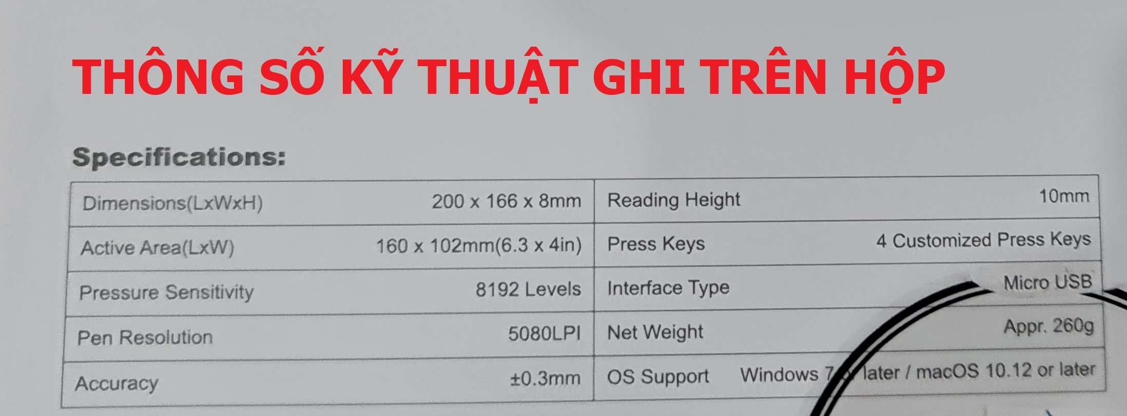 Vùng hoạt động 266.7 x 166.7mm Độ phân giải 5.080lpi (line per inch) Độ phản hồi 266rps Độ cảm ứng 10mm Độ chính xác ±0.3mm Độ nghiêng ±60° nghiêng Lực nhấn bút 8192 mức Phím