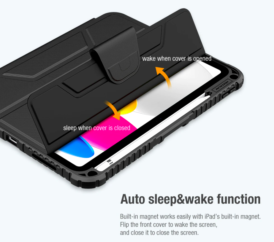 ChiếciPad Gen 10 của Bạn sẽ tự động tắt màn hình khi bạn đóng nắp Bao da chống sốc cho iPad Gen 10 hiệu Nillkin Bumber Pro có ngăn đựng bút lại, và sẽ mở màn hình khi bạn mở nắp bao da ra.