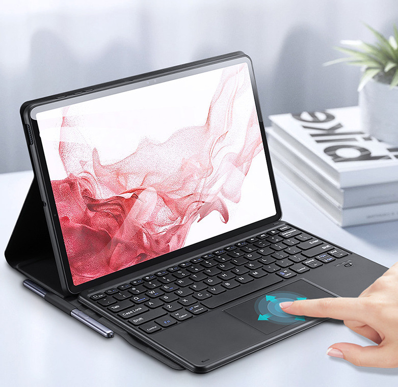 Bao da kèm bàn phím bluetooth có bàn di chuột chính hãng Dux Ducis giúp cho chiếc Galaxy Tab S9 Plus, S9 Fe Plus của các bạn trở thành một chiếc Laptop khá hoàn chỉnh. Kích thước nhỏ gọn mỏng đa năng thích hợp với giới văn phòng hoặc những bạn nào làm việc trên ipad mà phải di chuyển nhiều Keyboard thiết kê theo chuẩn QWERTY phổ thông dễ dàng sử dụng với các phím tắt tương thự như trên windows dải nút Funcion điểu khiển linh hoạt . Phần touch pad được tích hợp trên bàn phím như một chiếc Keyboard chính hãng của giúp giảm các thiết bị mang theo như chuột bluetooth cổng chuyển … Vỏ bọc ngoài bằng vải dạ dầy phủ kín phần máy và bàn phím , Ốp silicon ôm kín lưng máy bảo vệ tuyệt đối , chân đỡ máy mở ra gập vào gọn gàng lúc làm việc tạo độ nghiêng phu hợp cho người sử dụng thoải mái . Đóng mở thông minh tắt bật màn hình