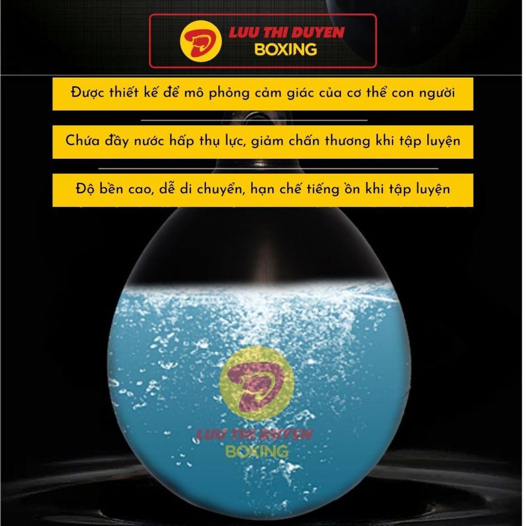 Bao đấm boxing nước thương hiệu Lừu Thị Duyên Boxing một sản phẩm chuyên dụng cho các vận động viên, các phòng tập đấm bốc, với thiết kế đặc biệt băng PVC đúc nguyên khối, chứa nước hấp thụ lực đấm, hạn chế nguy cơ chấn thương khi tập luyện. Giúp làm tăng hiệu quả tập luyện so với bao đấm truyền thống.