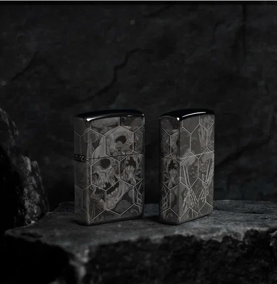 Được đóng khung theo họa tiết tổ ong phức tạp, nấm mọc ra từ những hộp sọ đang phân hủy trên mọi bề mặt của chiếc bật lửa High Polish Black cổ điển này với