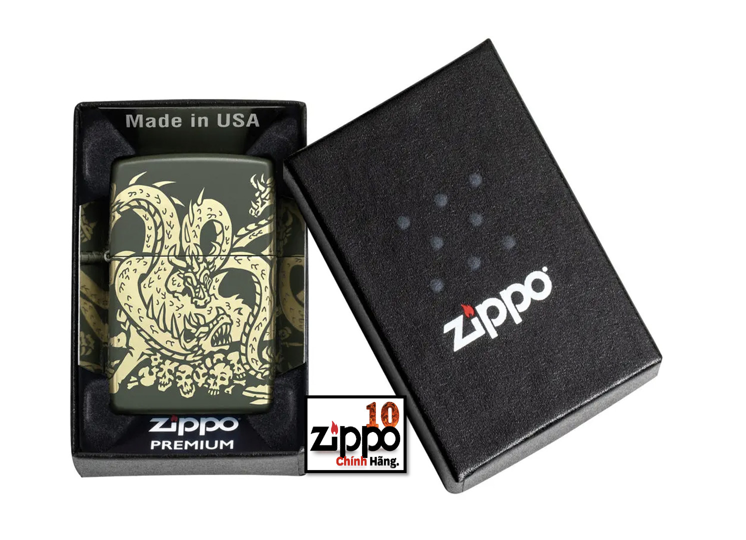 Mẫu Green Matte mạnh mẽ này đánh dấu sự ra mắt của phương pháp khắc Laser 360° sắc nét và chính xác trên các mẫu đế mờ đặc trưng của chúng tôi – một phương pháp xử lý trước đây chỉ dành riêng cho bề mặt trước. Tác phẩm được chỉ huy bởi một con rồng nhiều đầu trên đỉnh tàn tích của những kẻ thách thức nó, được mô tả bằng tông màu đồng sáng bóng. Được đóng gói trong một hộp đựng dạng quà tặng. Để tối ưu hiệu suất, hãy dùng nhiên liệu bật lửa của Zippo.