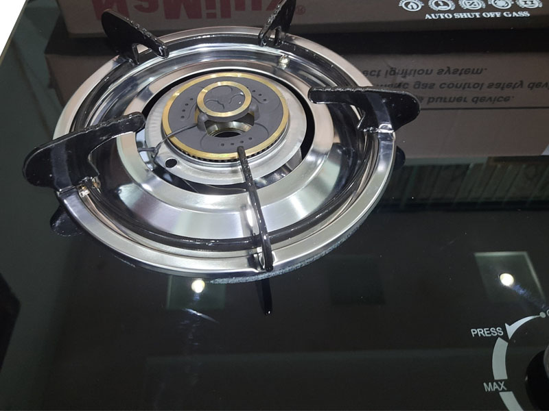 Bếp 02 lò: 01 lò to, 01 lò nhỏ Mâm chia lửa bằng đồng Hệ thống đánh lửa pin Pép hầm tiết kiệm gas Mặt kính cường lực, màu đen Kiềng gang đúc Lượng gas