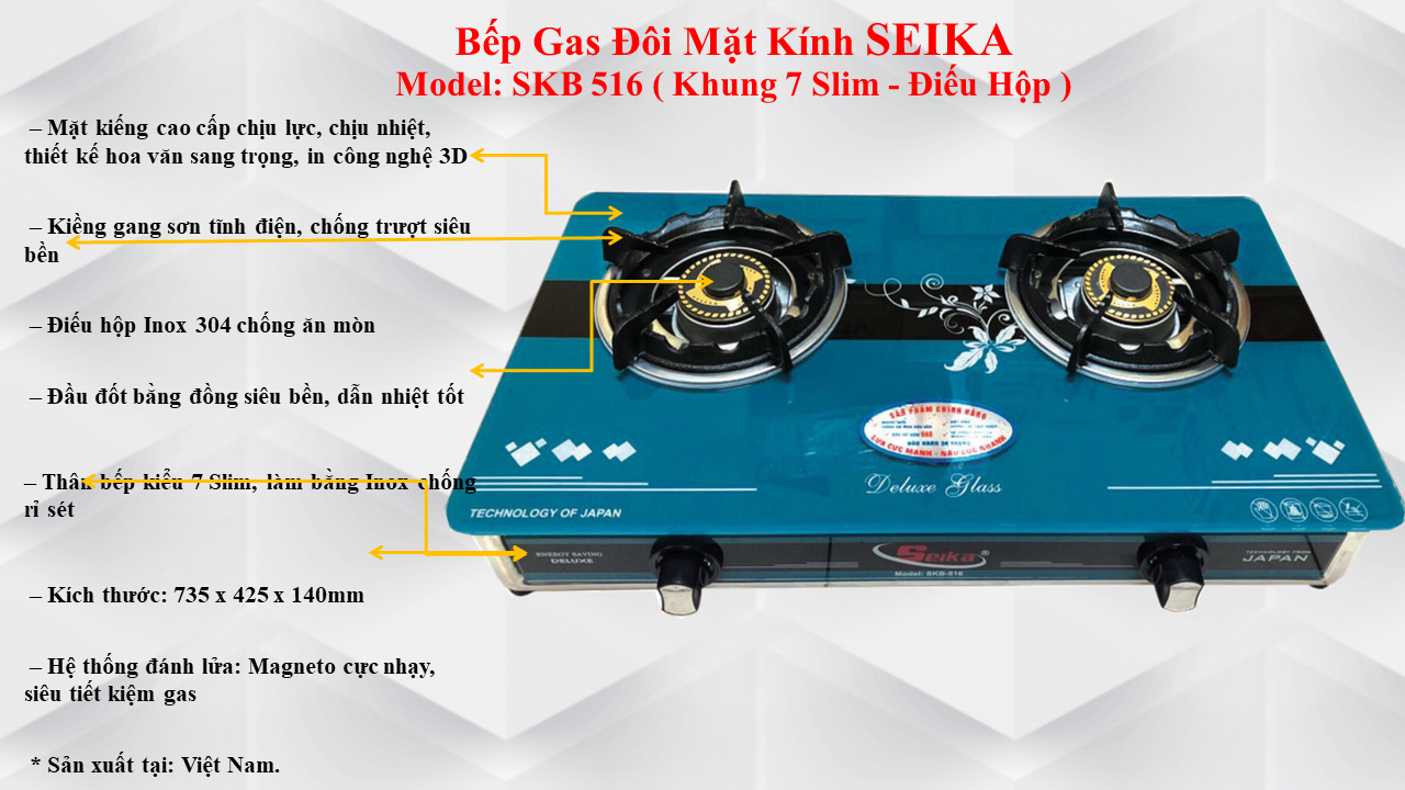 - Bếp Gas Đôi Mặt Kính Sen Đồng Seika SKB516 - Hàng Chính Hãng có thiết kế nhỏ gọn, dễ dàng phù hợp với nhiều không gian bếp, ngoài ra với bề mặt kính luôn