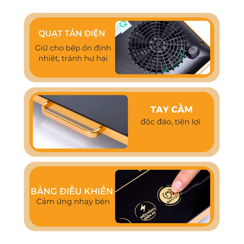 Thiết kế nhỏ gọn, đa chức năng nấu Bảng điều khiển cảm ứng hiện đại, dễ thao tác Mâm nhiệt đồng 100%, Công suất 2200W mạnh mẽ Gầm bếp bằng nhựa ABS an toàn, thoáng