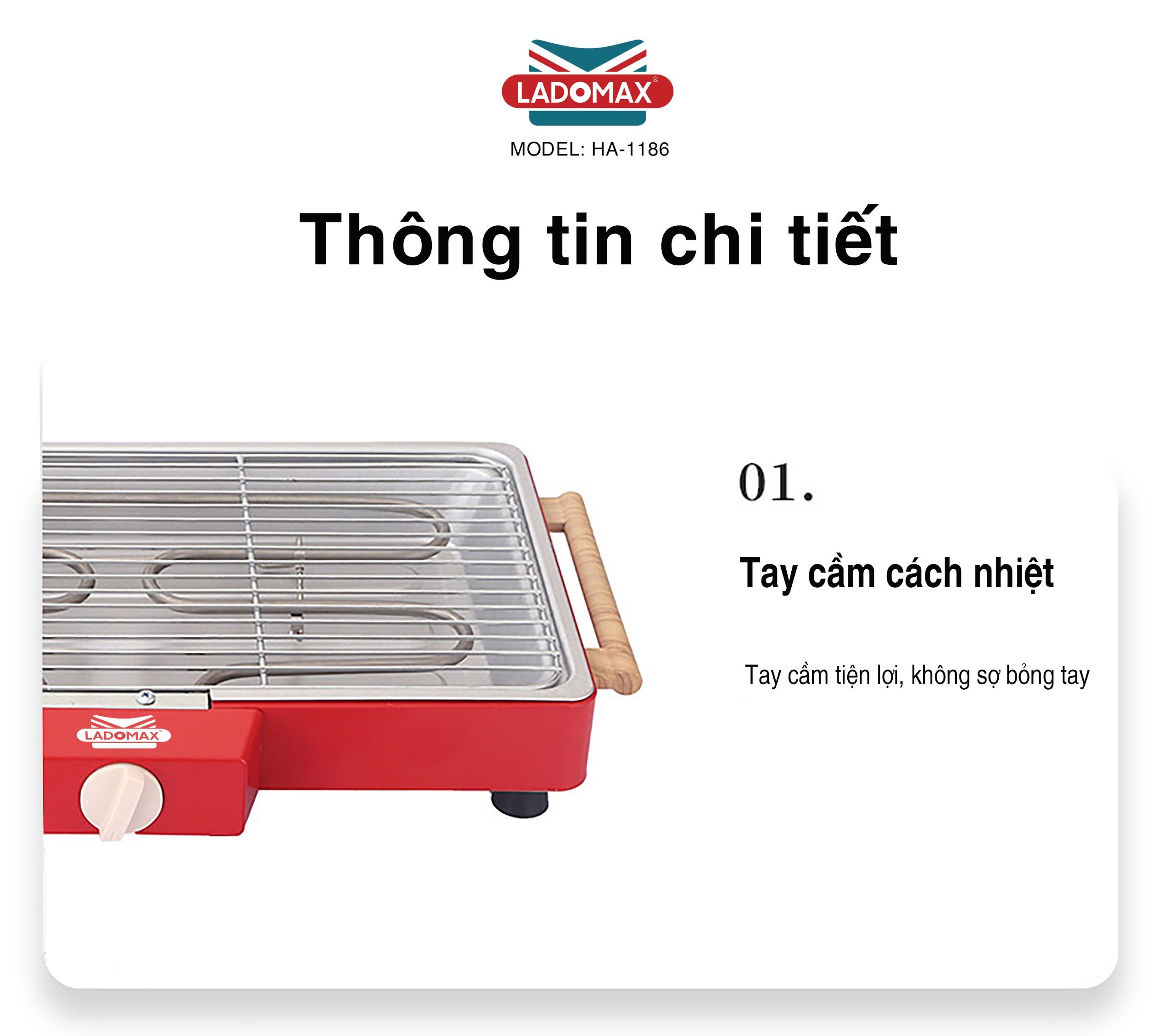 Tên sản phẩm: Bếp nướng điện đa năng Thương hiệu: Ladomax Model: HA-1186 Điện áp: 220V-50Hz Công suất: 1500W Cấu tạo: rời Chất liệu khay nướng: Nhôm Chất liệu vỉ nướng: Inox Khay hứng