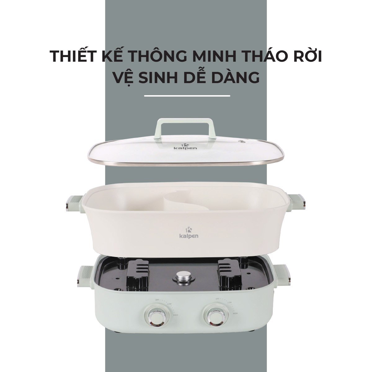 - Thiết kế hiện đại, màu sắc trang nhã Bếp nướng lẩu đa năng Kalpen 6.5L sở hữu kiểu dáng hiện đại với gam màu xám trắng và xanh hiện đại, trẻ trung làm nổi bật không gian nhà bếp. Dung tích lớn 6.5L nhưng bếp nướng lẩu Kalpen được thiết kế nhỏ gọn giúp tiết kiệm không gian sống và thuận tiện cho việc sử dụng trên bàn ăn. Vung nồi là kính cường lực trong suốt, khi nấu nướng dễ dàng quan sát được đồ ăn bên trong mà không cần phải mở vung để kiểm tra nhiều lần. Bếp nướng lẩu Kalpen 6.5L có thiết kế thành miệng cao, người dùng thoải mái tận hưởng việc thưởng thức đồ ăn mà không lo nước sôi làm tràn đồ ăn ra ngoài, cũng không ngại việc nướng đồ ăn dầu mỡ bắn ra xung quanh nhiều.