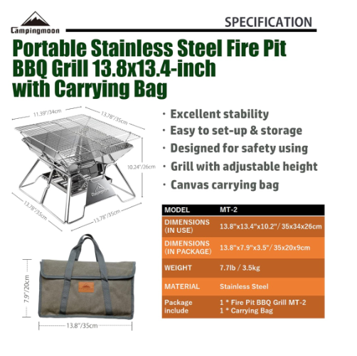 MÔ TẢ SẢN PHẨM BẾP NƯỚNG THAN HOA GẤP GỌN CHO 5-8 NGƯỜI CAMPINGMOON MT-3 * THÔNG TIN SẢN PHẨM: - Thương hiệu: Campingmoon - Mã sản phẩm: MT-3 - Chất liệu: stainless steel, iron