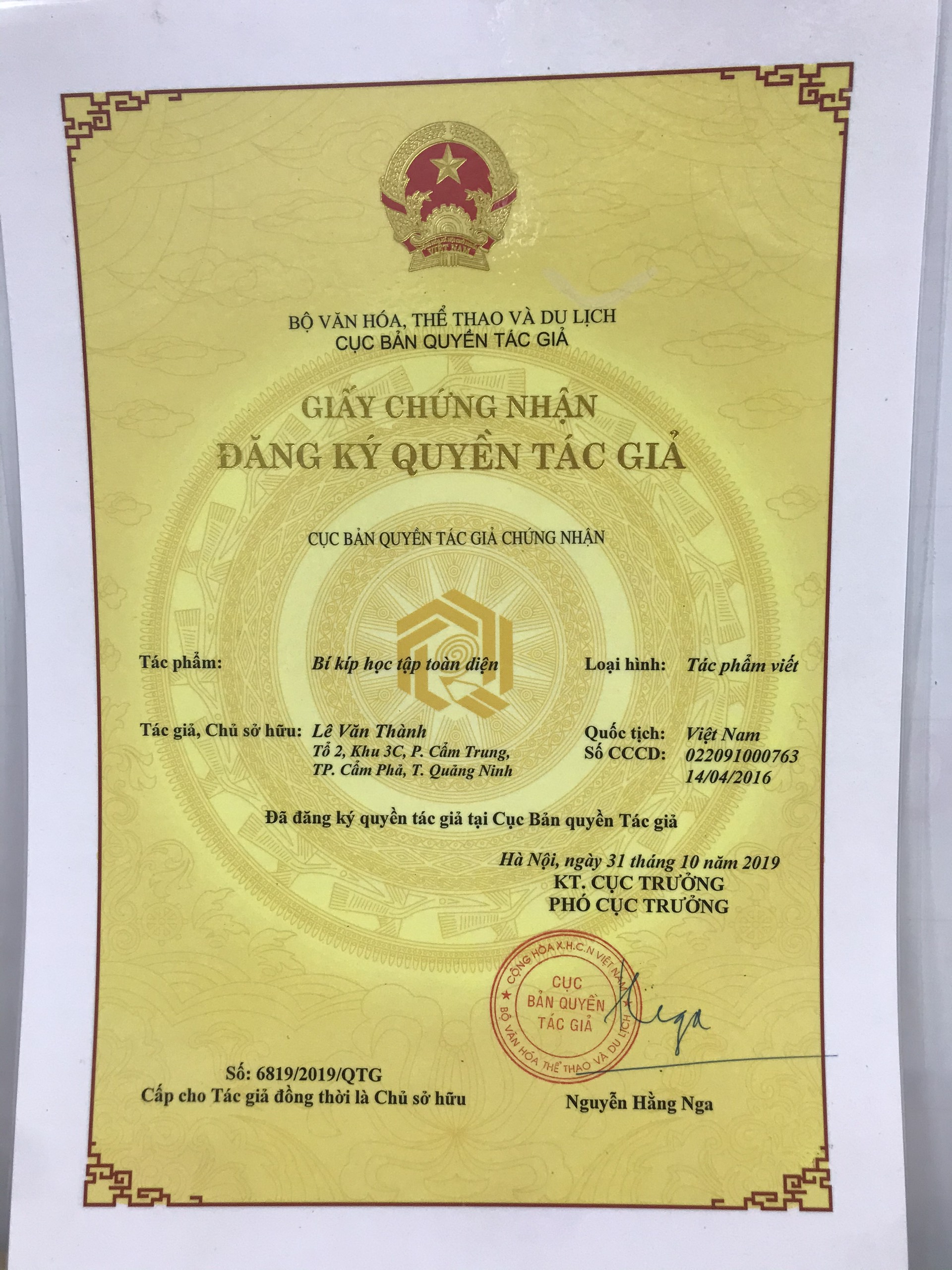 Cuốn sách được cấp: GIẤY CHỨNG NHẬN ĐĂNG KÍ QUYỀN TÁC GIẢ từ Cục bản quyền tác giả - Bộ văn hóa thể thao và du lịch.
