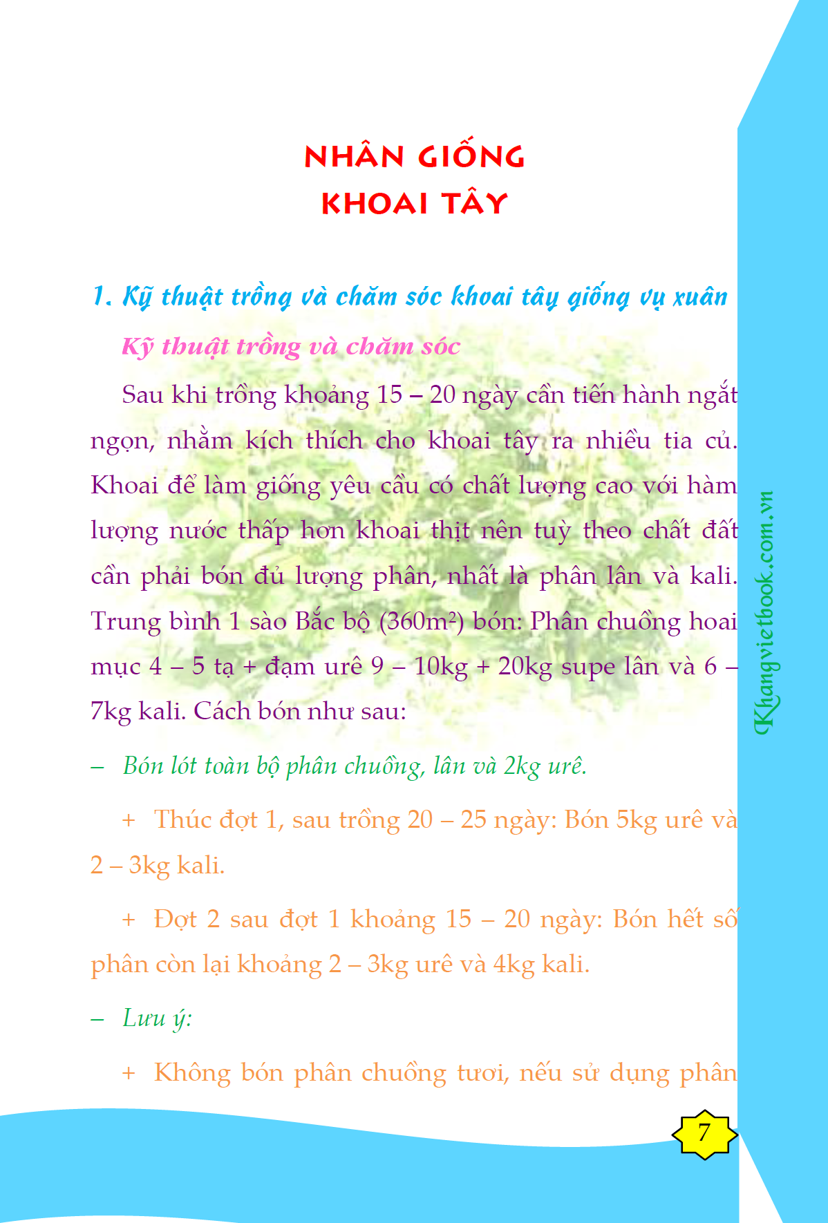 Bí Quyết Thành Công Kĩ Thuật Trồng Khoai Tây Hiệu Quả   Nước ta có gần 70% dân số sống ở khu vực nông thôn. Phát triển kinh tế nông thôn được xem là yếu tố quan trọng đảm bảo sự phát triển bền vững của quốc gia. Sau gần 15 năm thực hiện đổi mới kinh tế, nông nghiệp và phát triển nông thôn Việt Nam đã đạt được những bước tiến quan trọng. Đổi mới trong nông nghiệp đã mở đầu cho nền kinh tế ở Việt Nam, tạo nền tảng vững chắc giúp Việt Nam phát triển kinh tế. Trong thời gian qua, nhiều giống cây trồng, vật nuôi và thủy hải sản được tạo ra, nhất là một số giống có ưu thế đã đưa vào sản xuất trên diện rộng, góp phần tăng năng suất, chất lượng, hiệu quả sản xuất và sức cạnh tranh cho nông sản Việt Nam. Đến nay đã có trên 90% diện tích lúa, 80% diện tích ngô, 60% diện tích mía, cây an quả được dùng giống mới. Đã có 90 cây trồng được chọn tạo như: Nhãn, vải, bưởi, xoài, chuối, dứa, dưa hấu, nấ, đưa tỉ trọng áp dụng giống tiến bộ kỹ thuật trong sản xuất nông nghiệp lên 35%. Đối với chăn nuôi, nhiều công thức lai tạo giống lợn được công nhận đưa vào nghiên cứu và sản xuất đại trà, điển hình là lợn 3 máu và 4 máu ngoại của các dòng cao sản (Landrace, Yorshire, Pietrain, Duroc), bò sữa, bò thịt, dê, gà Riêng đối với thủy sản, đã áp dụng có hiệu quả công nghệ nhân giống nhân tạo một số loại thủy sản có giá trị kinh tế cao như tôm sú, tôm hùm, cá tra, ba Nông nghiệp là một ngành kinh tế quan trọng trong quá trình phát triển của mỗi quốc gia. Nước ta đi lên chủ nghĩa xã hội từ một nước nông nghiệp lạc hậu, gần 80% dân số ở nông thôn. Vì vậy, phát triển nông nghiệp – nông thôn là vấn đề có tầm chiến lược quan trọng cả về kinh tế, chính trị, xã hội và môi trường sinh thái. Để giúp bạn đọc tham khảo, vận dụng vào chăn nuôi, trồng trọt đạt hiệu quả, chúng tôi giới thiệu bộ sách gồm  những nội dung về các giống vật nuôi, cây trồng, khả năng sản xuất và kỹ thuật chăm sóc nuôi dưỡng cũng như các biện pháp phòng trị bệnh. Hy vọng bộ sách sẽ đồng hành cùng bạn.