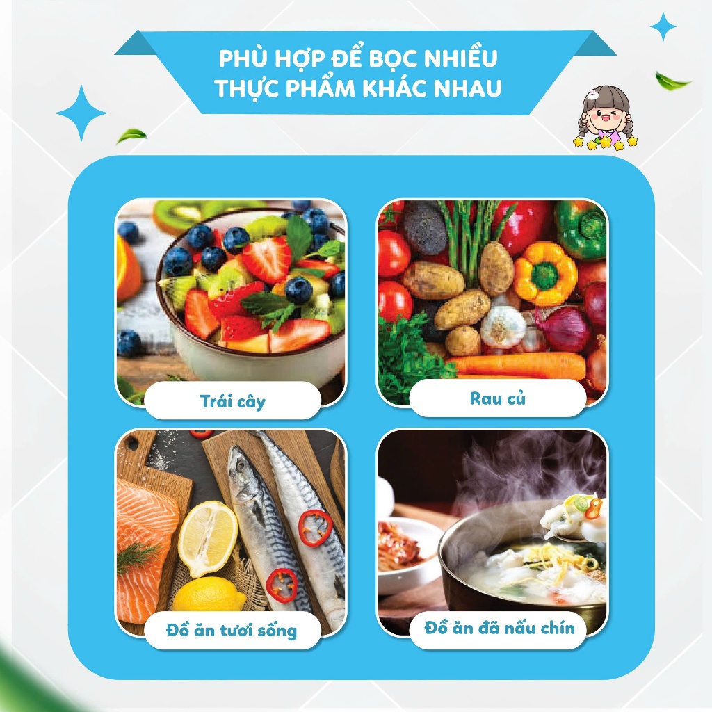 Chất liệu nhựa PE cao cấp dẻo dai Thiết kế thông minh với viền bo chun co giãn cực tốt. Dễ dàng bọc kín miệng các loại bát, tô, đĩa, hộp,... mà không cần kéo