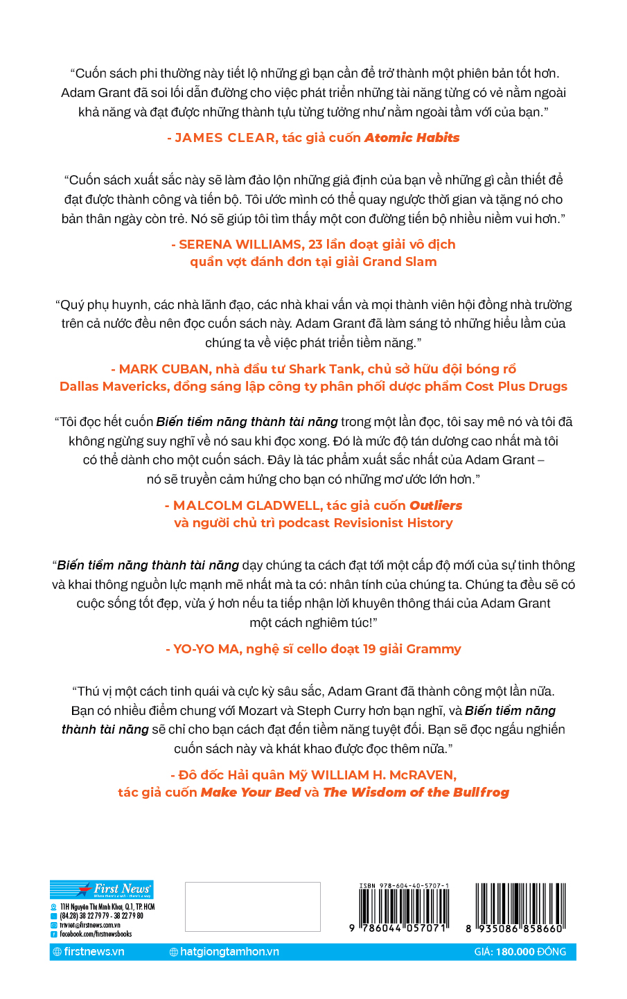 Thông qua những lập luận sắc bén và các ví dụ vừa thực tiễn vừa thú vị, Adam Grant giúp người đọc nhận ra rằng “thành công không chỉ là đạt được mục tiêu mà còn là sống theo các giá trị chúng ta coi trọng. Không có giá trị nào cao cả hơn việc khao khát trở thành một người tốt hơn so với phiên bản của ta ở hiện tại. Không có thành tựu nào vĩ đại hơn việc giải phóng tiềm năng còn đang ẩn giấu trong ta”. Vì lẽ đó, “Biến tiềm năng thành tài năng” không chỉ là một tác phẩm giàu cảm hứng mà còn mang đến một cái nhìn toàn diện về cách chúng ta có thể khai phá tiềm năng của bản thân và những người xung quanh.