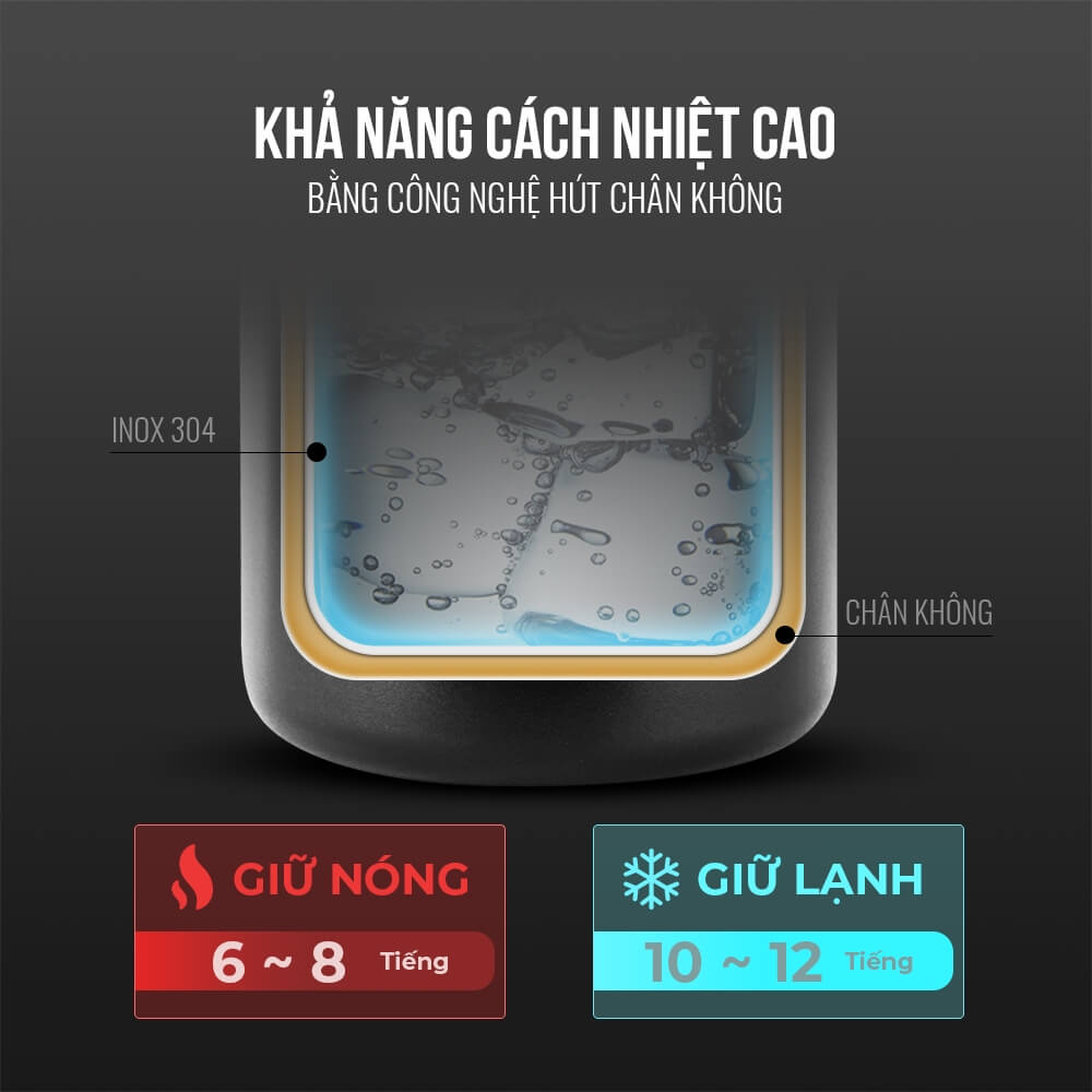 Sử dụng inox 304 tuyệt đối an toàn cho sức khỏe Dung tích 500ml Công nghệ hút chân không tối ưu, giữ nóng 8h và giữ lạnh lên đến 12h Thiết kế mạnh mẽ, có