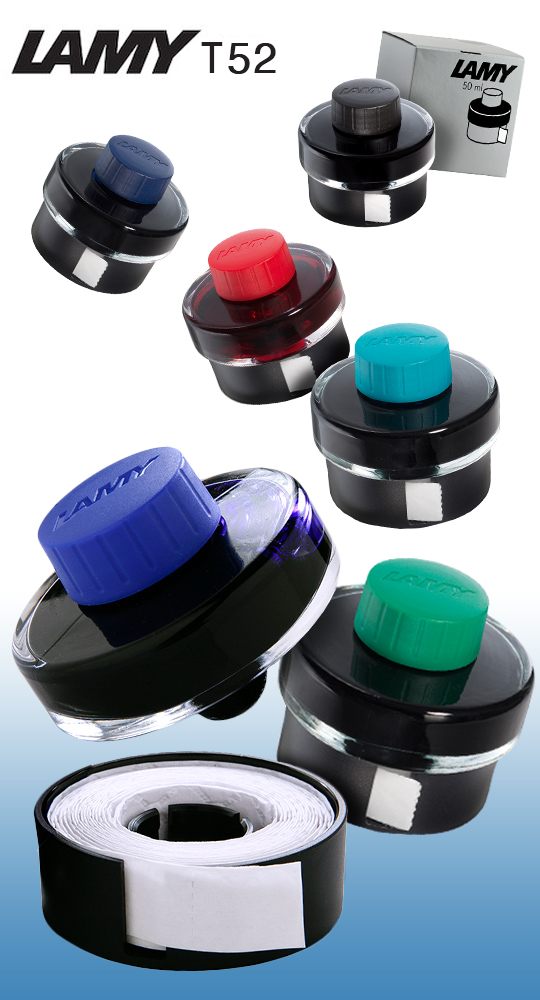 Mực Lamy T 51: - Bã mực lắng xuống phần trũng. - Bình nhựa. - Dung tích: 30 ml - Màu sắc: có ba màu là xanh (dễ tẩy), đen và đỏ.