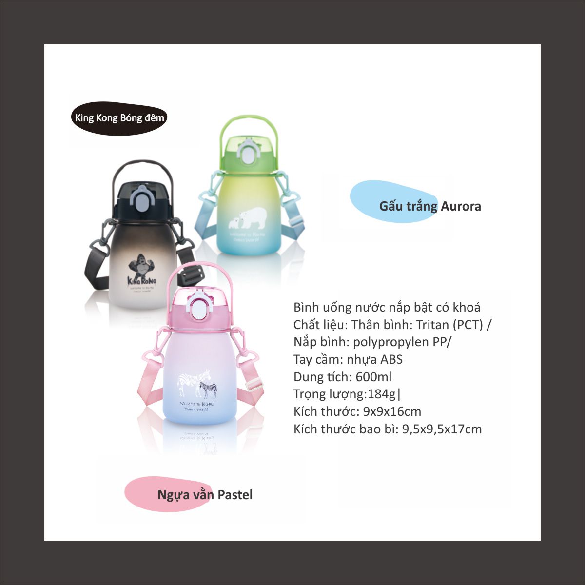 * Thương hiệu: KU.KU Duckbill * Xuất xứ: Đài Loan; Nhà máy sản xuất: Trung Quốc * Chất liệu: - Thân bình: PCT (Tritan) (chịu nhiệt 100 độ C) - Tay cầm: nhựa ABS (chịu