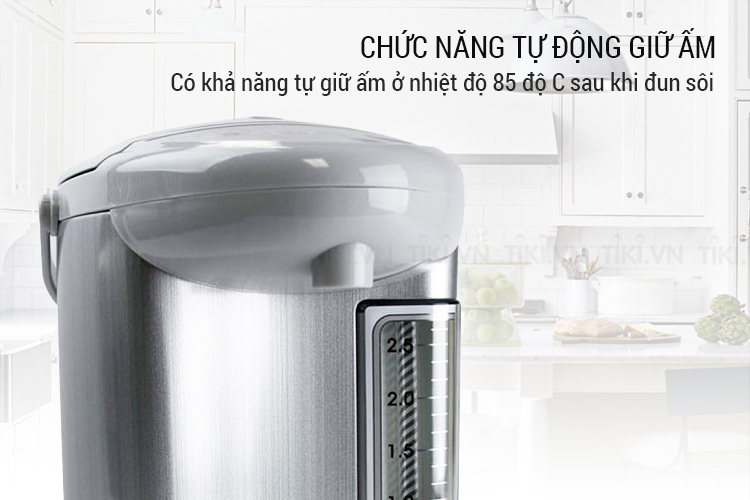 - Dung tích: 4.5 lít - Công suất: 700W - Chức năng: Đun sôi, Giữ nóng - Mức nhiệt giữ nóng: 3 mức: 60, 85, 98°C - Hẹn giờ đun sôi: Sau 6 tiếng -