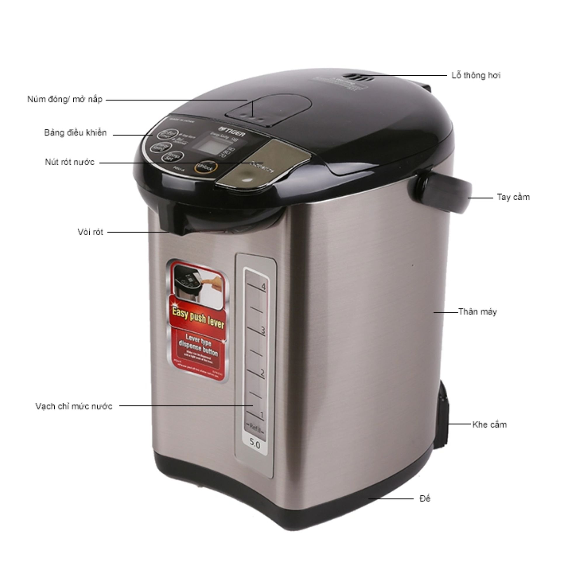 Bình thủy điện Tiger PDU-A50W - Thông số kỹ thuật: Dung tích: 5 lít Kích thước: 23.2×30.4×32.8(cm) Khối lượng: 3kg Điện áp định mức: 220V Thương hiệu: Tiger Xuất xứ: Japan - Đặc điểm nổi